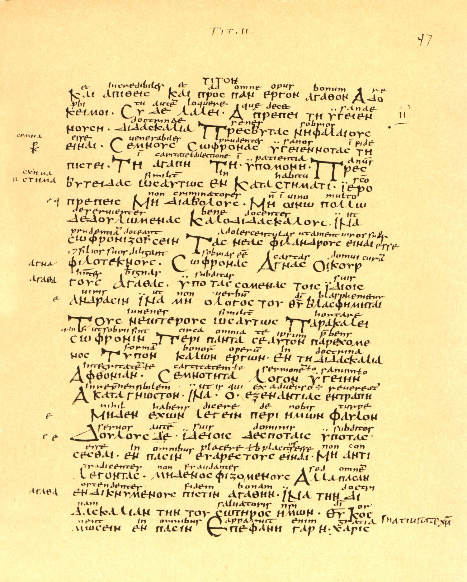 Codex Boernerianus is a ninth century manuscript of Paul on parchment; Greek–Latin diglot (interlinear); 99 leaves, single column, 20–23 lines per column. Digital images were provided to CSNTM by Gary S. Dykes.