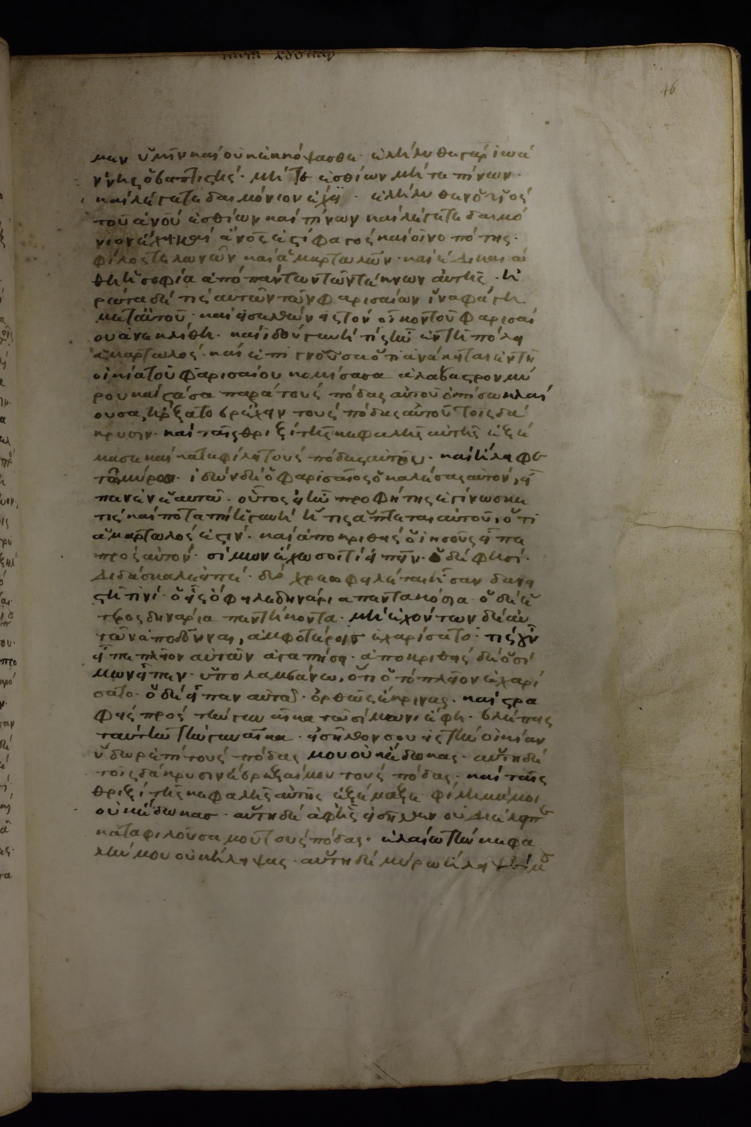 καὶ στᾶσα ὀπίσω παρὰ τοὺς πόδας αὐτοῦ κλαίουσα, τοῖς δάκρυσιν ἤρξατο βρέχειν τοὺς πόδας αὐτοῦ καὶ ταῖς θριξὶν τῆς κεφαλῆς αὐτῆς ἐξέμασσεν, καὶ κατεφίλει τοὺς πόδας αὐτοῦ καὶ ἤλειφεν τῷ μύρῳ.