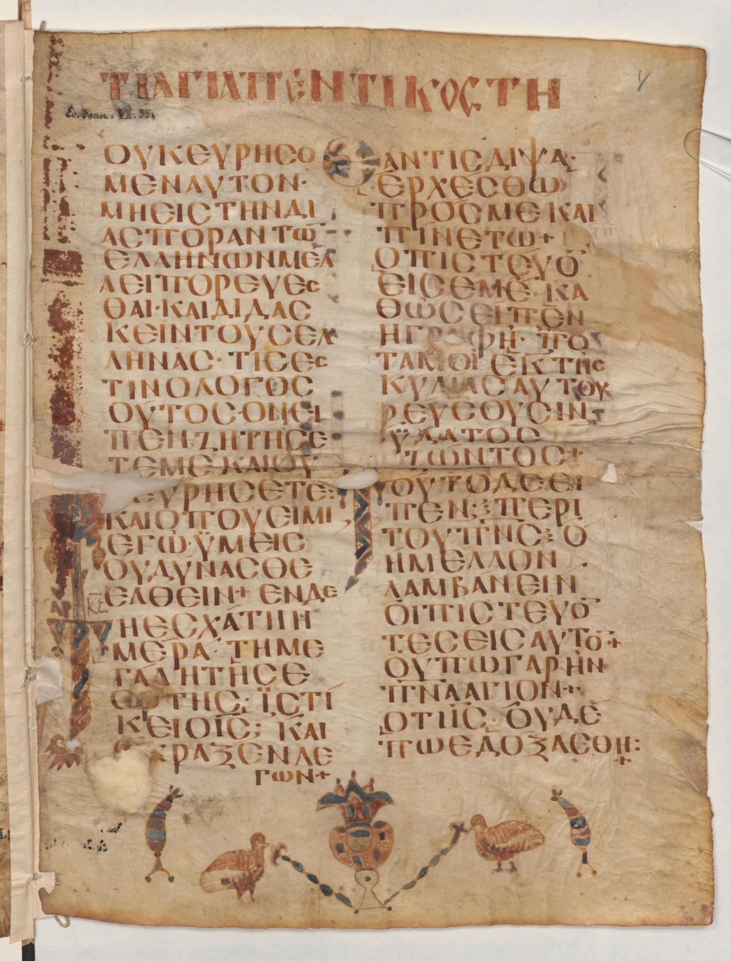 Tenth century majuscule of the Gospels on parchment; 4 leaves, 2 columns, 24 lines per column. Images are made available by the Österreichische Nationalbibliothek.