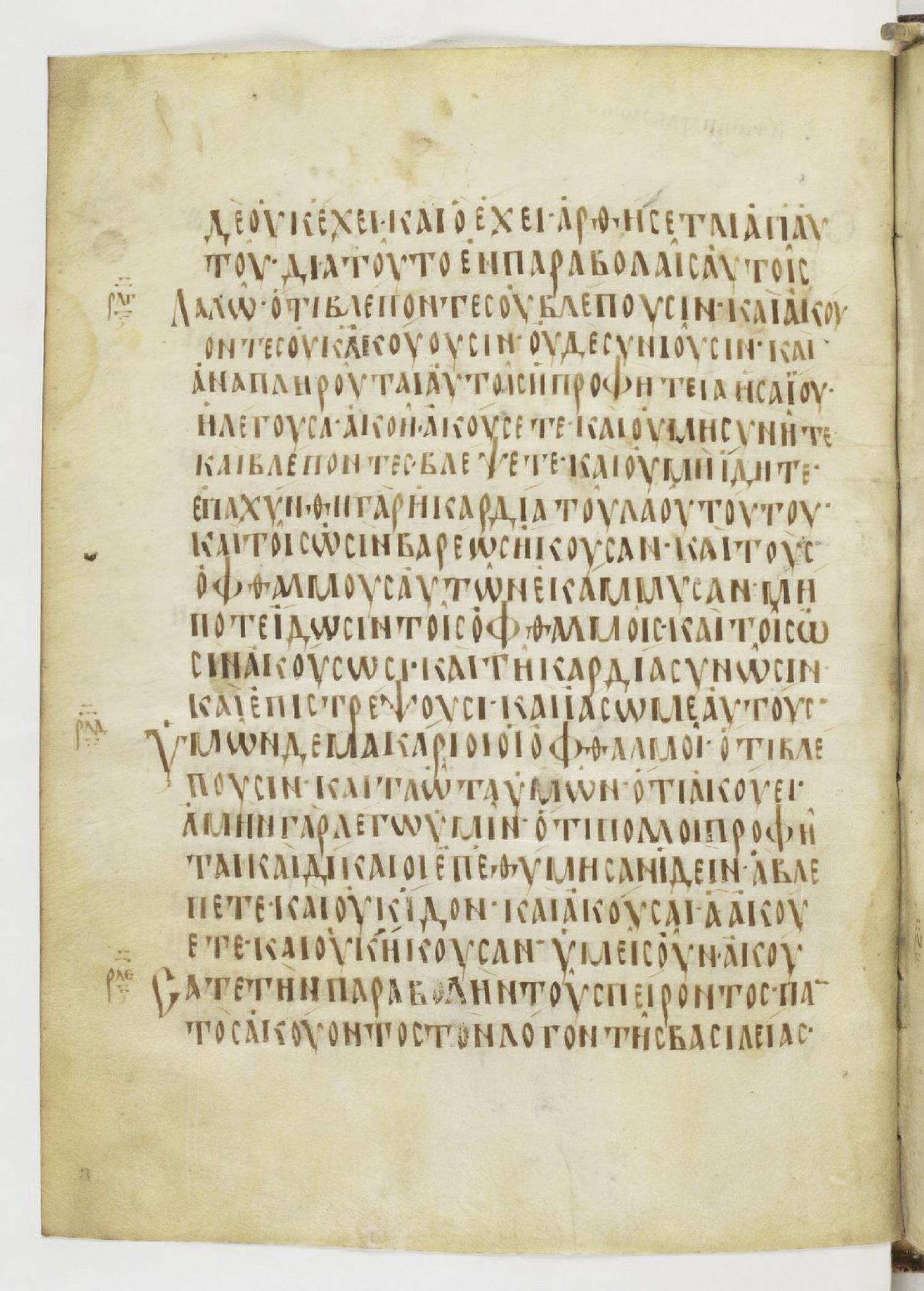 Codex Cyprius is a ninth century manuscript of the Gospels on parchment; 267 leaves, single column, 16–31 lines per column. For recent images, please visit the Bibliothèque Nationale