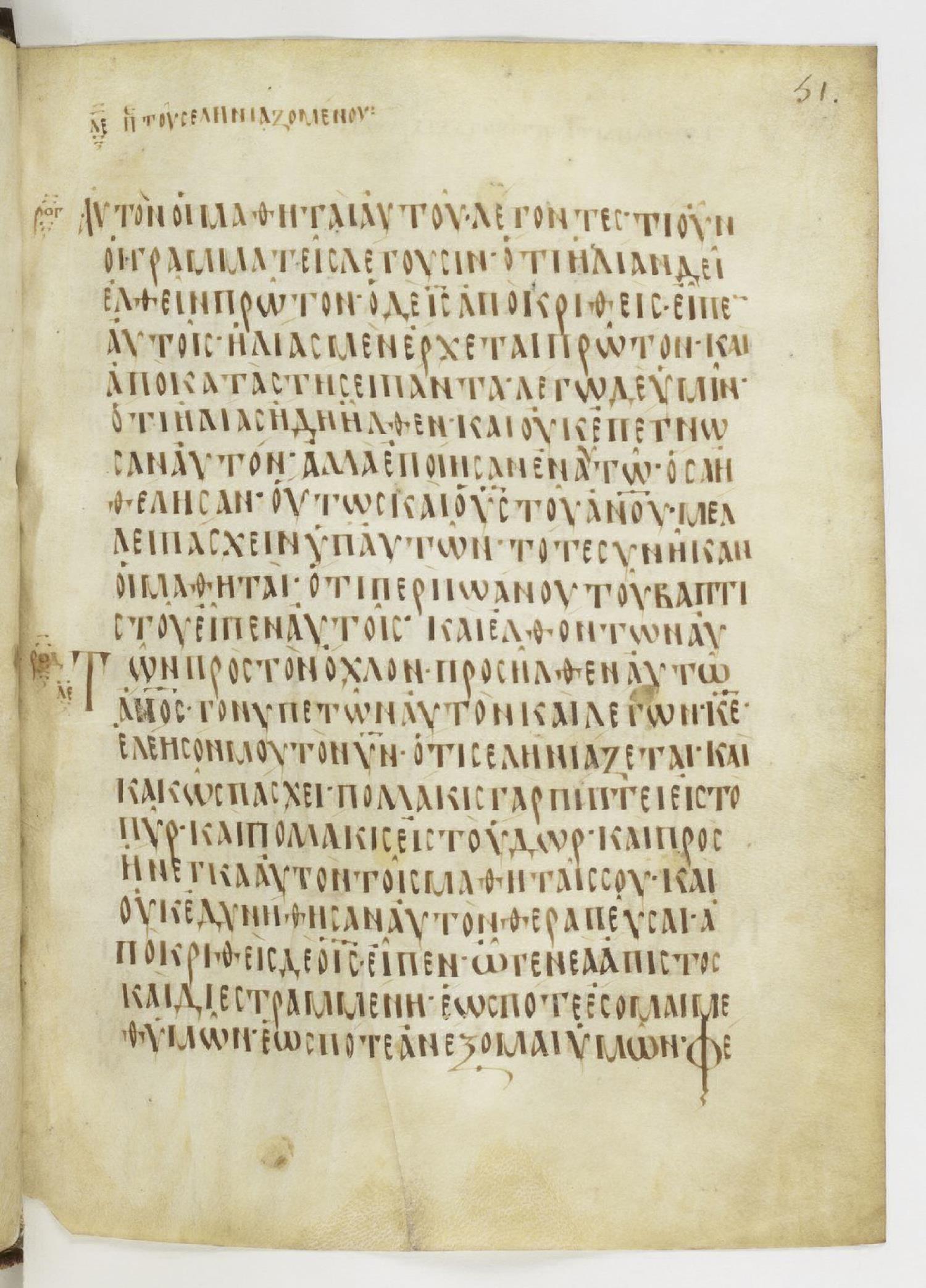 Καὶ ἐπηρώτησαν αὐτὸν οἱ μαθηταὶ λέγοντες Τί οὖν οἱ γραμματεῖς λέγουσιν ὅτι Ἠλείαν / Ἠλίαν δεῖ ἐλθεῖν πρῶτον;