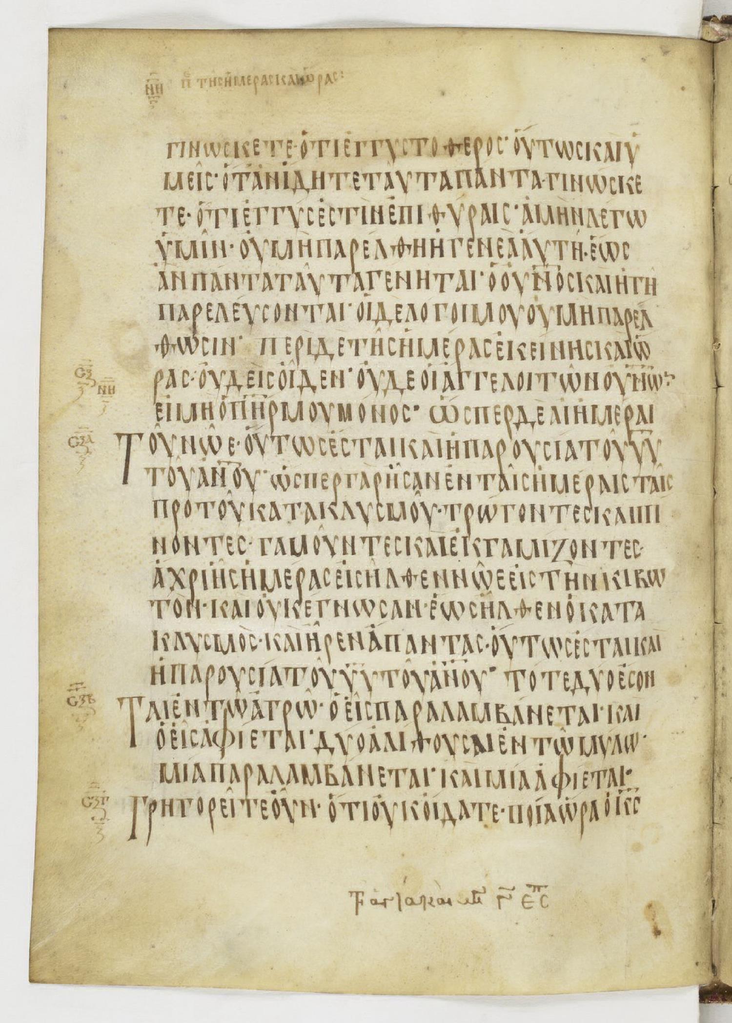 Codex Cyprius is a ninth century manuscript of the Gospels on parchment; 267 leaves, single column, 16–31 lines per column. For recent images, please visit the Bibliothèque Nationale