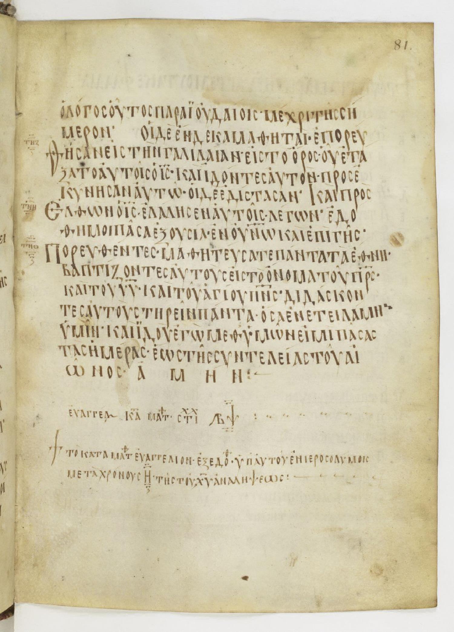Codex Cyprius is a ninth century manuscript of the Gospels on parchment; 267 leaves, single column, 16–31 lines per column. For recent images, please visit the Bibliothèque Nationale