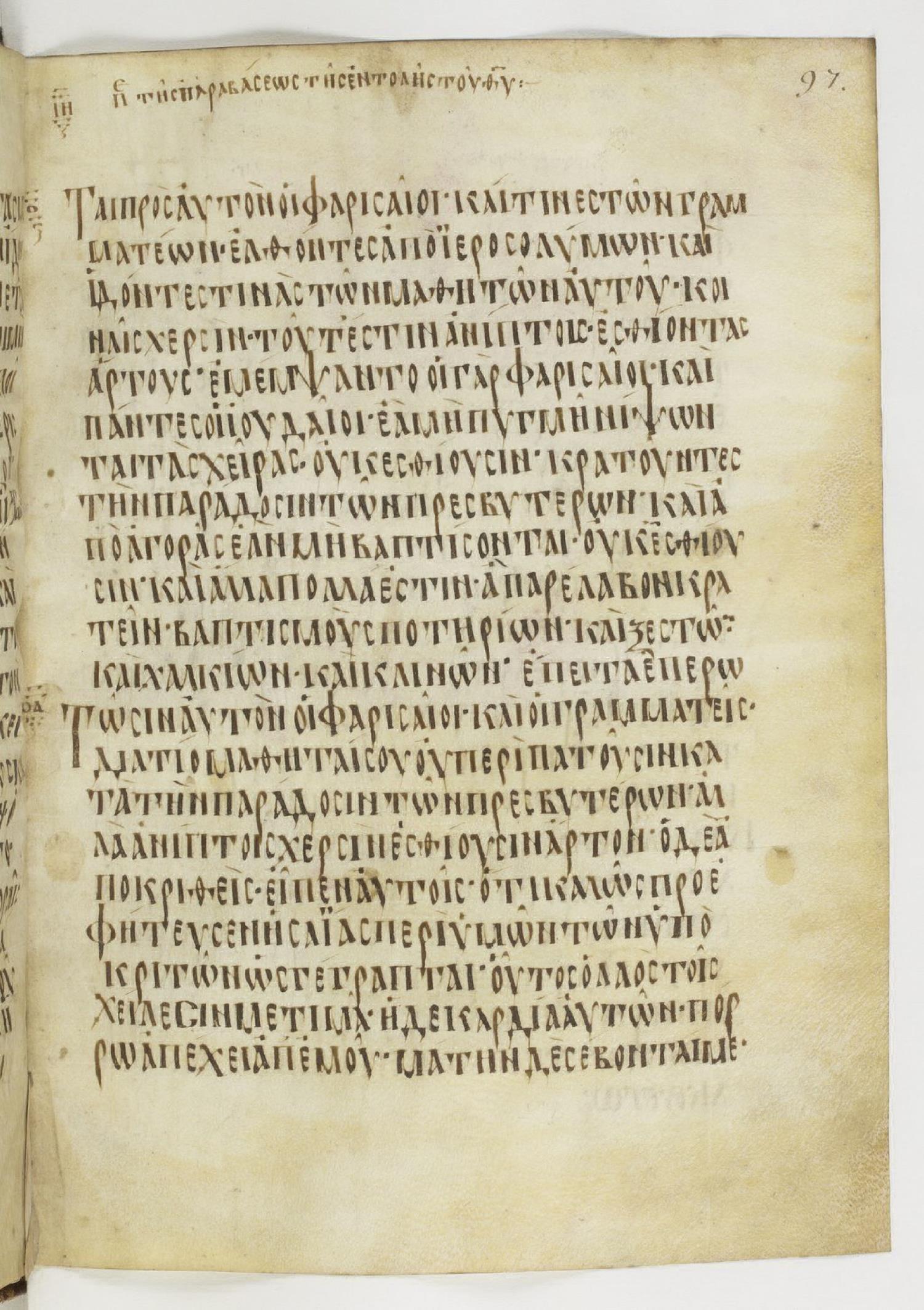 Καὶ συνάγονται πρὸς αὐτὸν οἱ Φαρισαῖοι καί τινες τῶν γραμματέων ἐλθόντες ἀπὸ Ἰεροσολύμων