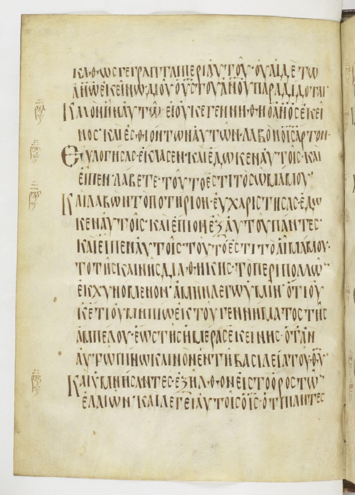 Codex Cyprius is a ninth century manuscript of the Gospels on parchment; 267 leaves, single column, 16–31 lines per column. For recent images, please visit the Bibliothèque Nationale