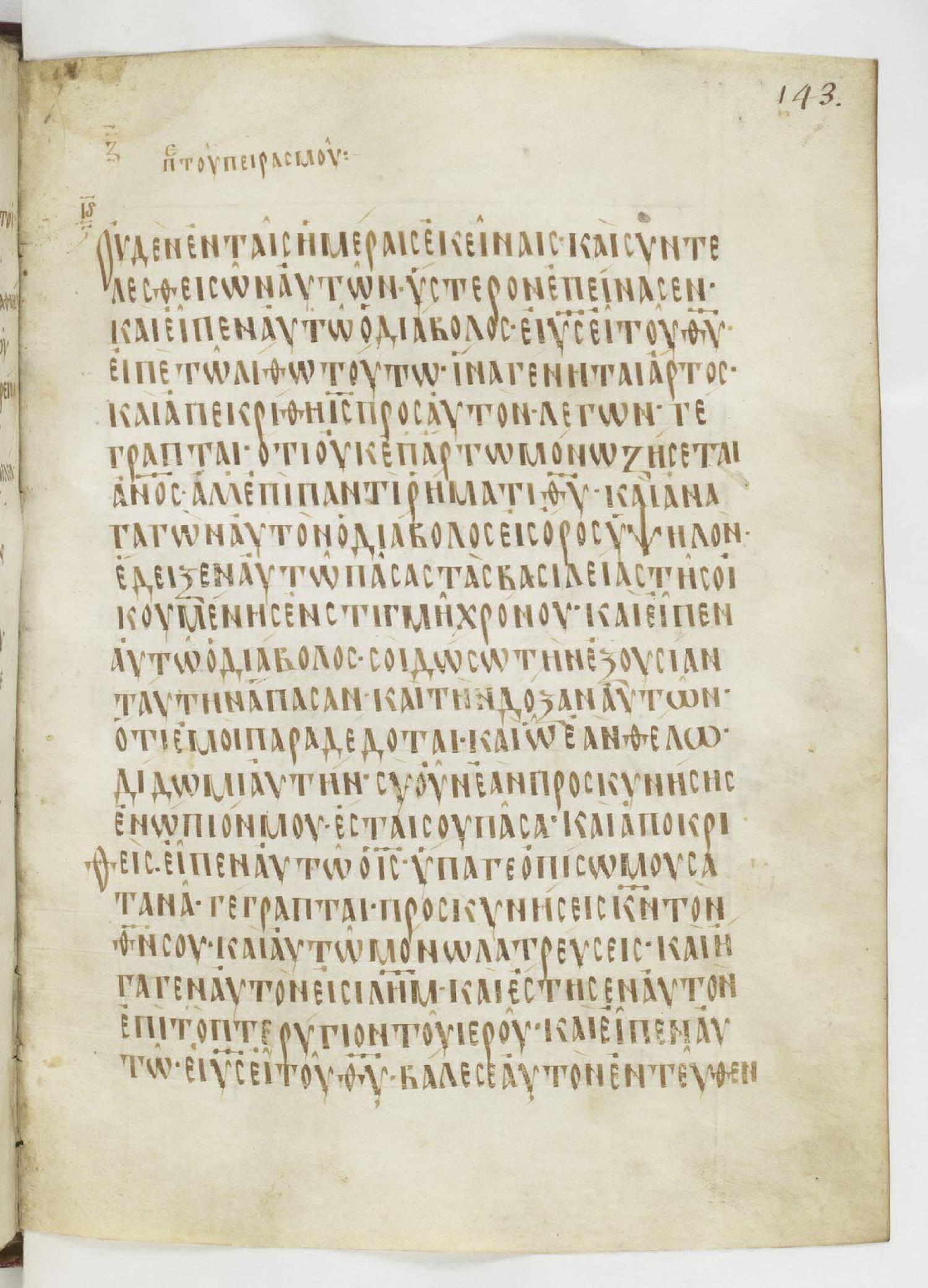 ἡμέρας τεσσεράκοντα πειραζόμενος ὑπὸ τοῦ διαβόλου. Καὶ οὐκ ἔφαγεν οὐδὲν ἐν ταῖς ἡμέραις ἐκείναις, καὶ συντελεσθεισῶν αὐτῶν ἐπείνασεν.