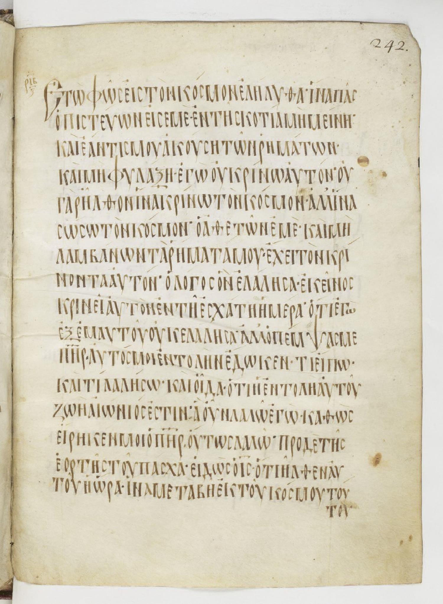 Codex Cyprius is a ninth century manuscript of the Gospels on parchment; 267 leaves, single column, 16–31 lines per column. For recent images, please visit the Bibliothèque Nationale