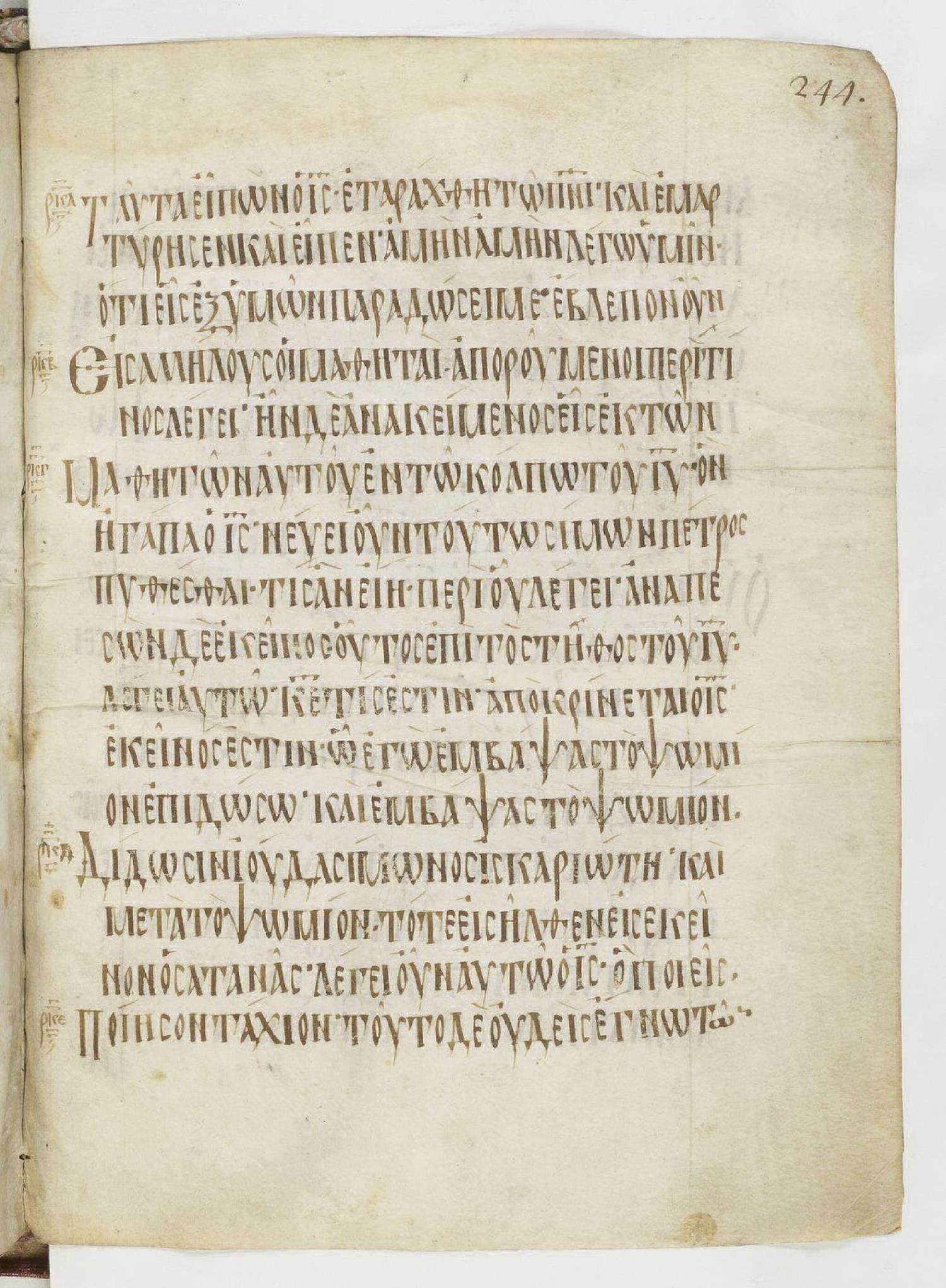 Codex Cyprius is a ninth century manuscript of the Gospels on parchment; 267 leaves, single column, 16–31 lines per column. For recent images, please visit the Bibliothèque Nationale