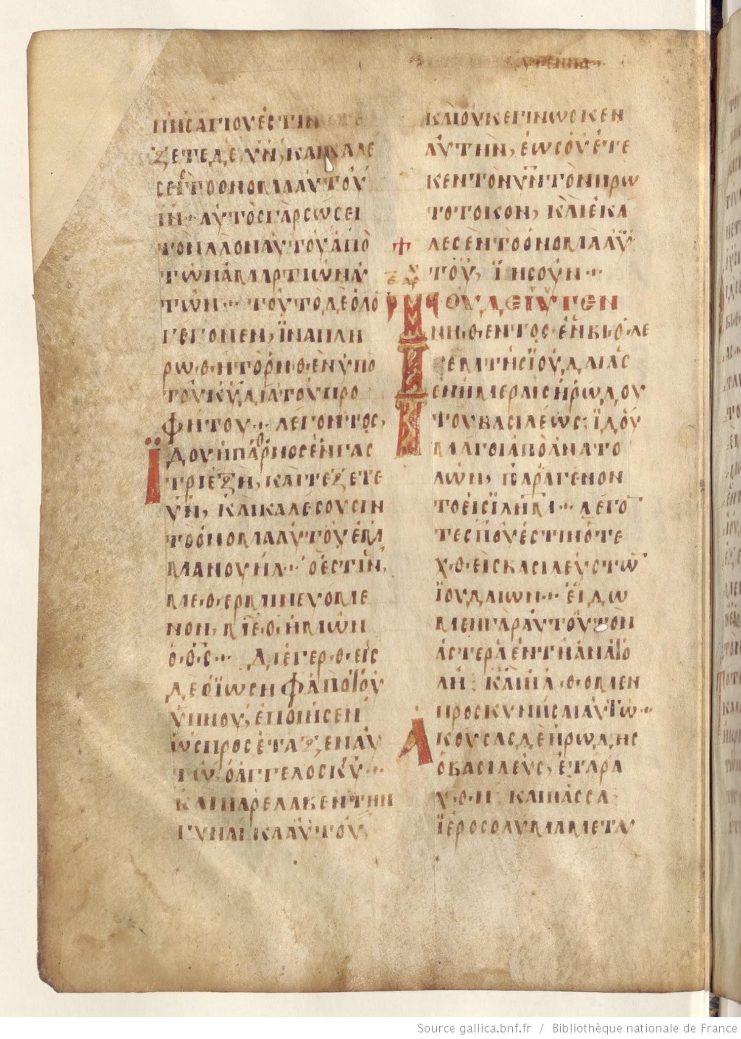 Codex Regius is an eighth-century (alt. date ninth-century) manuscript of the Gospels on parchment; 257 leaves, 2 columns, 25 lines per column. Only a selection of images are available at this time. For recent images please see the Bibliothèque Nationale.