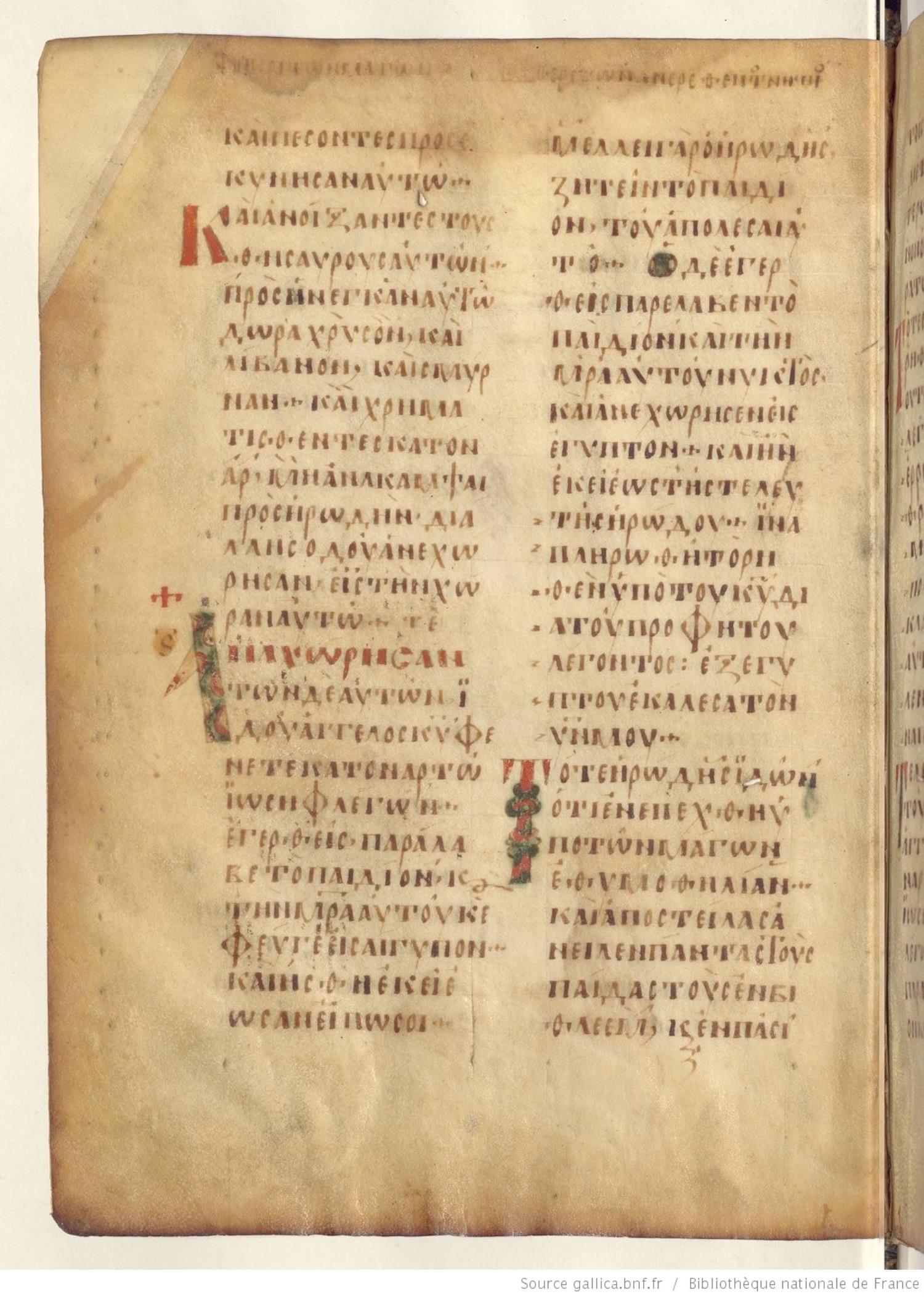 Ἀναχωρησάντων δὲ αὐτῶν ἰδοὺ ἄγγελος Κυρίου φαίνεται κατ´ ὄναρ τῷ Ἰωσὴφ λέγων Ἐγερθεὶς παράλαβε τὸ παιδίον καὶ τὴν μητέρα αὐτοῦ καὶ φεῦγε εἰς Αἴγυπτον, καὶ ἴσθι ἐκεῖ ἕως ἂν εἴπω σοι· μέλλει γὰρ Ἡρῴδης ζητεῖν τὸ παιδίον τοῦ ἀπολέσαι αὐτό.