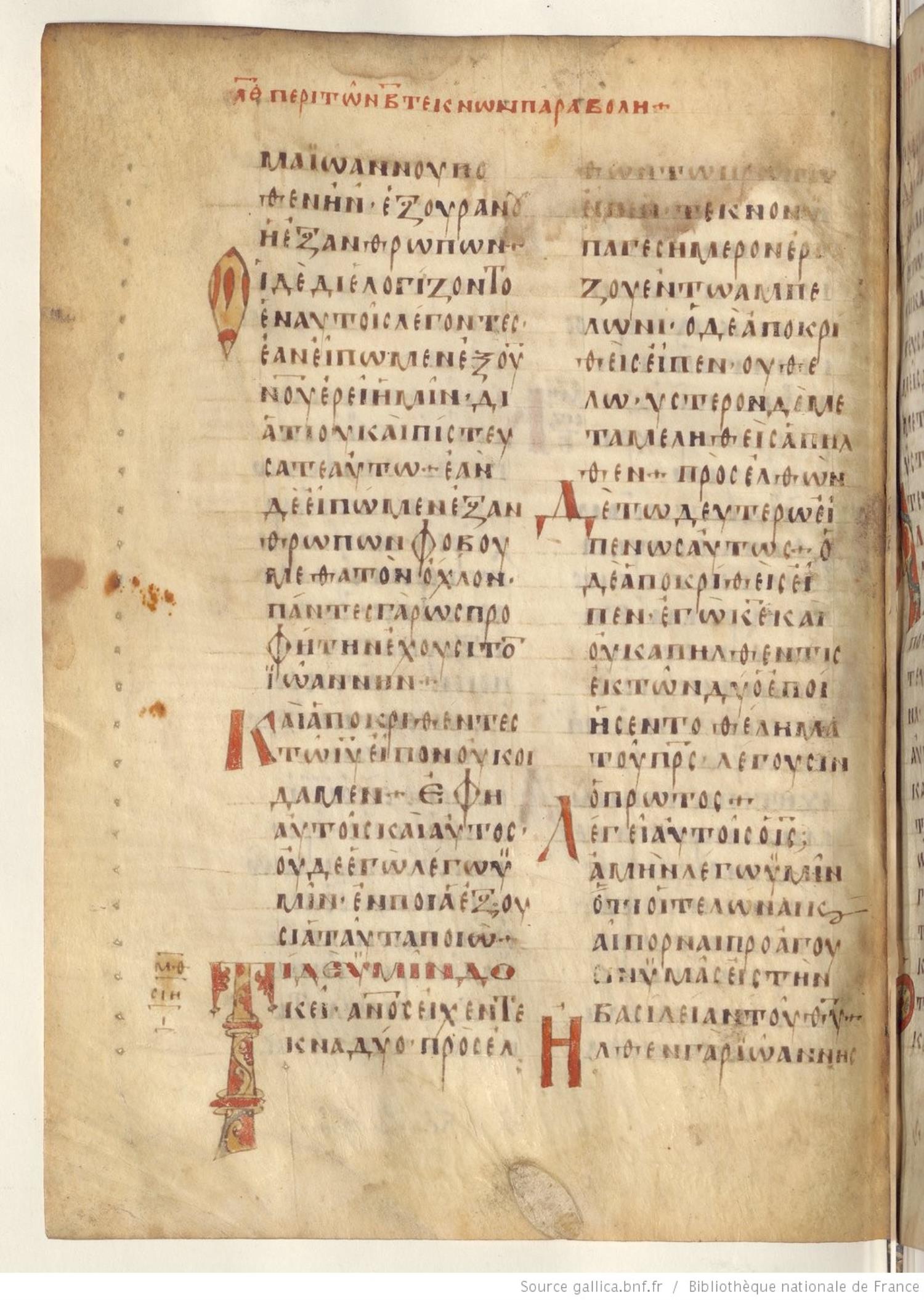 τίς ἐκ τῶν δύο ἐποίησεν τὸ θέλημα τοῦ πατρός; λέγουσιν Ὁ ὕστερος / πρῶτος. λέγει αὐτοῖς ὁ Ἰησοῦς Ἀμὴν λέγω ὑμῖν ὅτι οἱ τελῶναι καὶ αἱ πόρναι προάγουσιν ὑμᾶς εἰς τὴν βασιλείαν τοῦ θεοῦ.