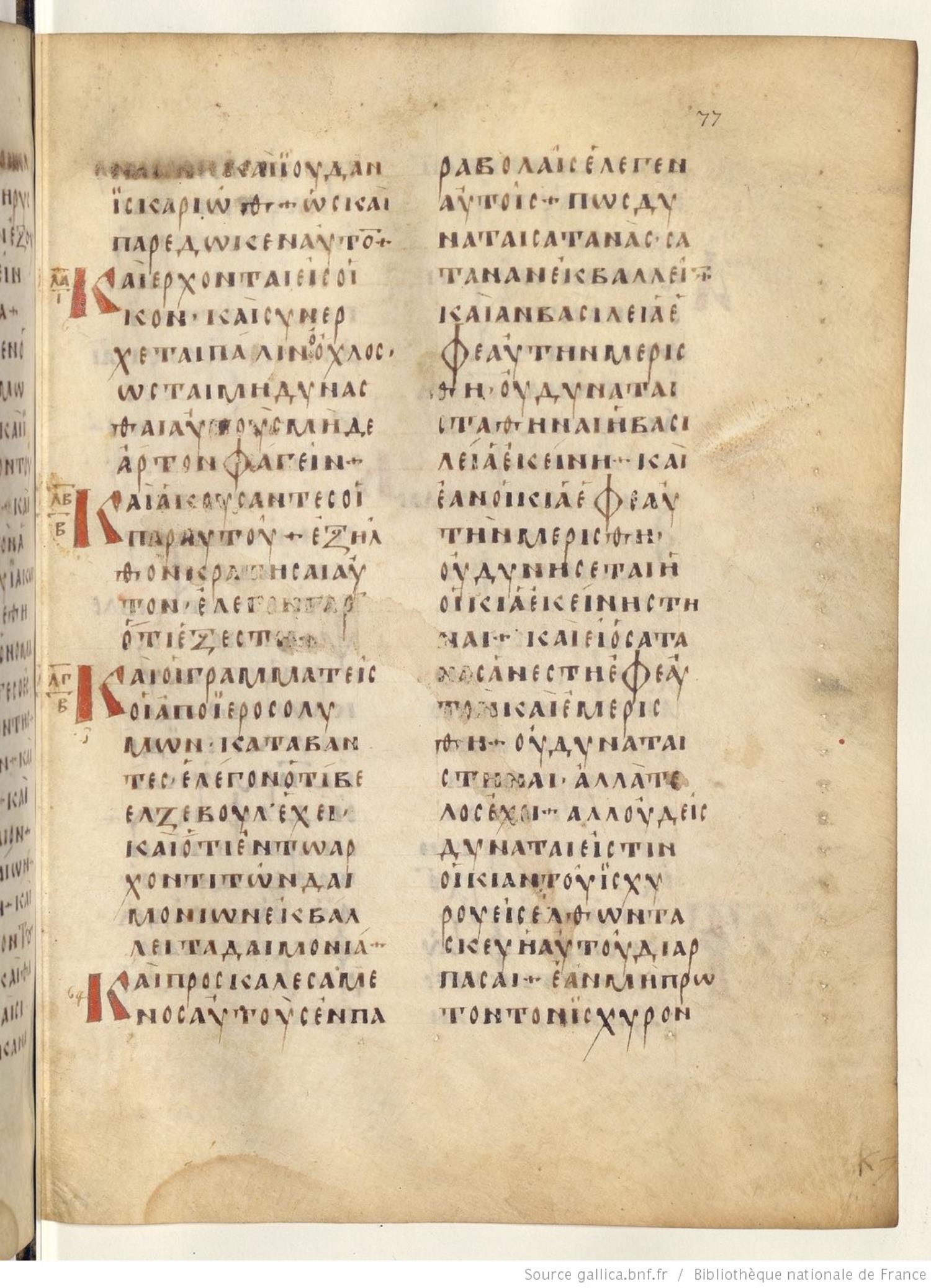 καὶ οἱ γραμματεῖς οἱ ἀπὸ Ἰεροσολύμων καταβάντες ἔλεγον ὅτι Βεεζεβοὺλ / Βεελζεβοὺλ ἔχει, καὶ ὅτι ἐν τῷ ἄρχοντι τῶν δαιμονίων ἐκβάλλει τὰ δαιμόνια.