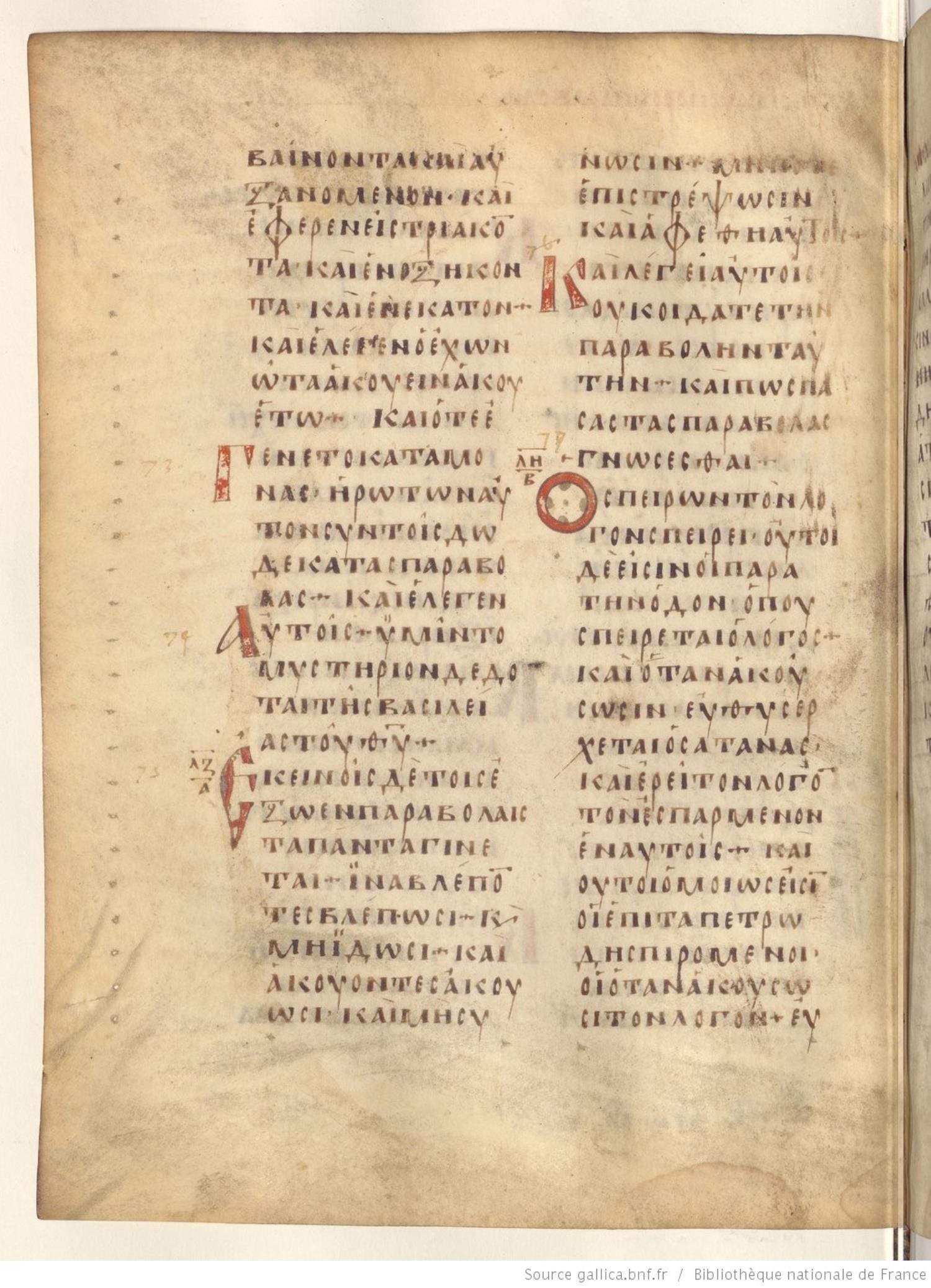 Codex Regius is an eighth-century (alt. date ninth-century) manuscript of the Gospels on parchment; 257 leaves, 2 columns, 25 lines per column. Only a selection of images are available at this time. For recent images please see the Bibliothèque Nationale.