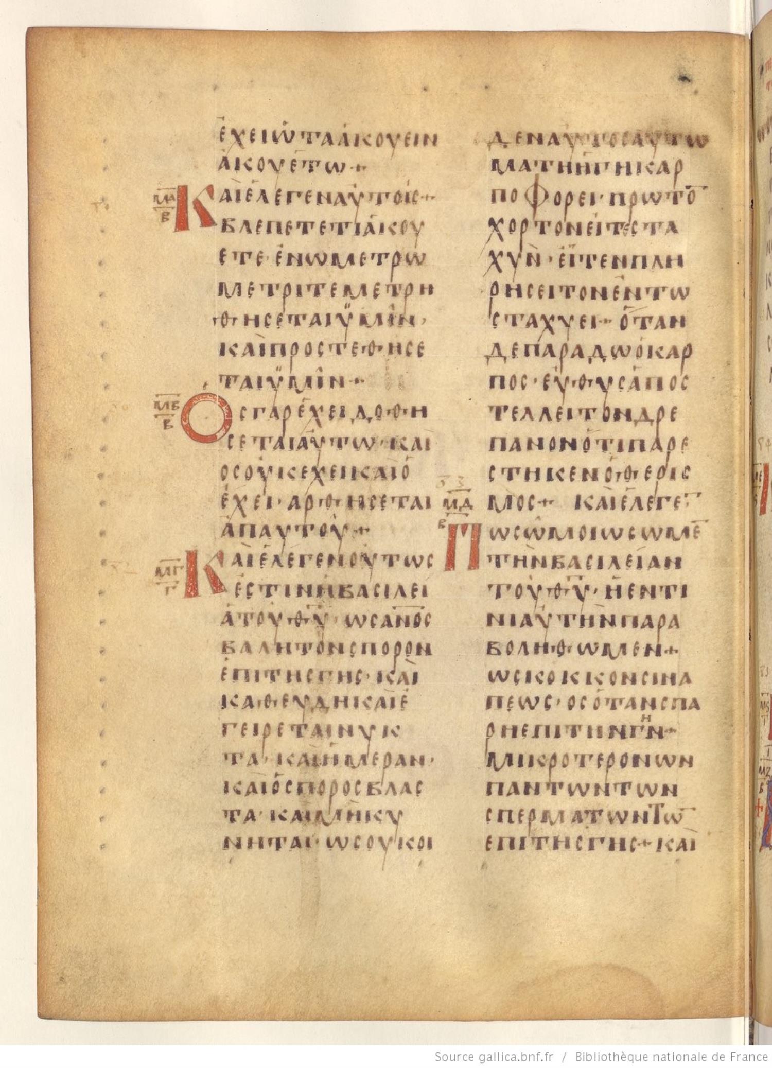 Codex Regius is an eighth-century (alt. date ninth-century) manuscript of the Gospels on parchment; 257 leaves, 2 columns, 25 lines per column. Only a selection of images are available at this time. For recent images please see the Bibliothèque Nationale.