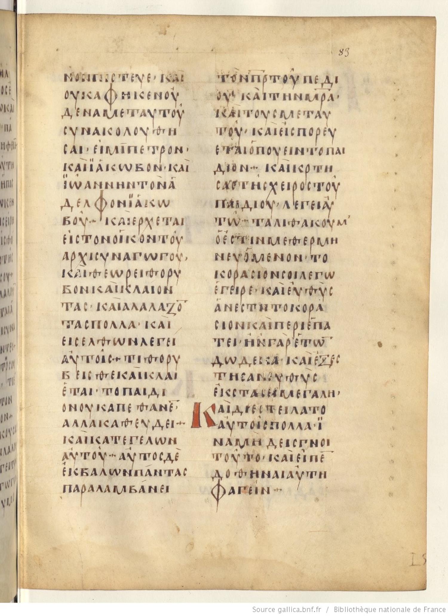 Codex Regius is an eighth-century (alt. date ninth-century) manuscript of the Gospels on parchment; 257 leaves, 2 columns, 25 lines per column. Only a selection of images are available at this time. For recent images please see the Bibliothèque Nationale.