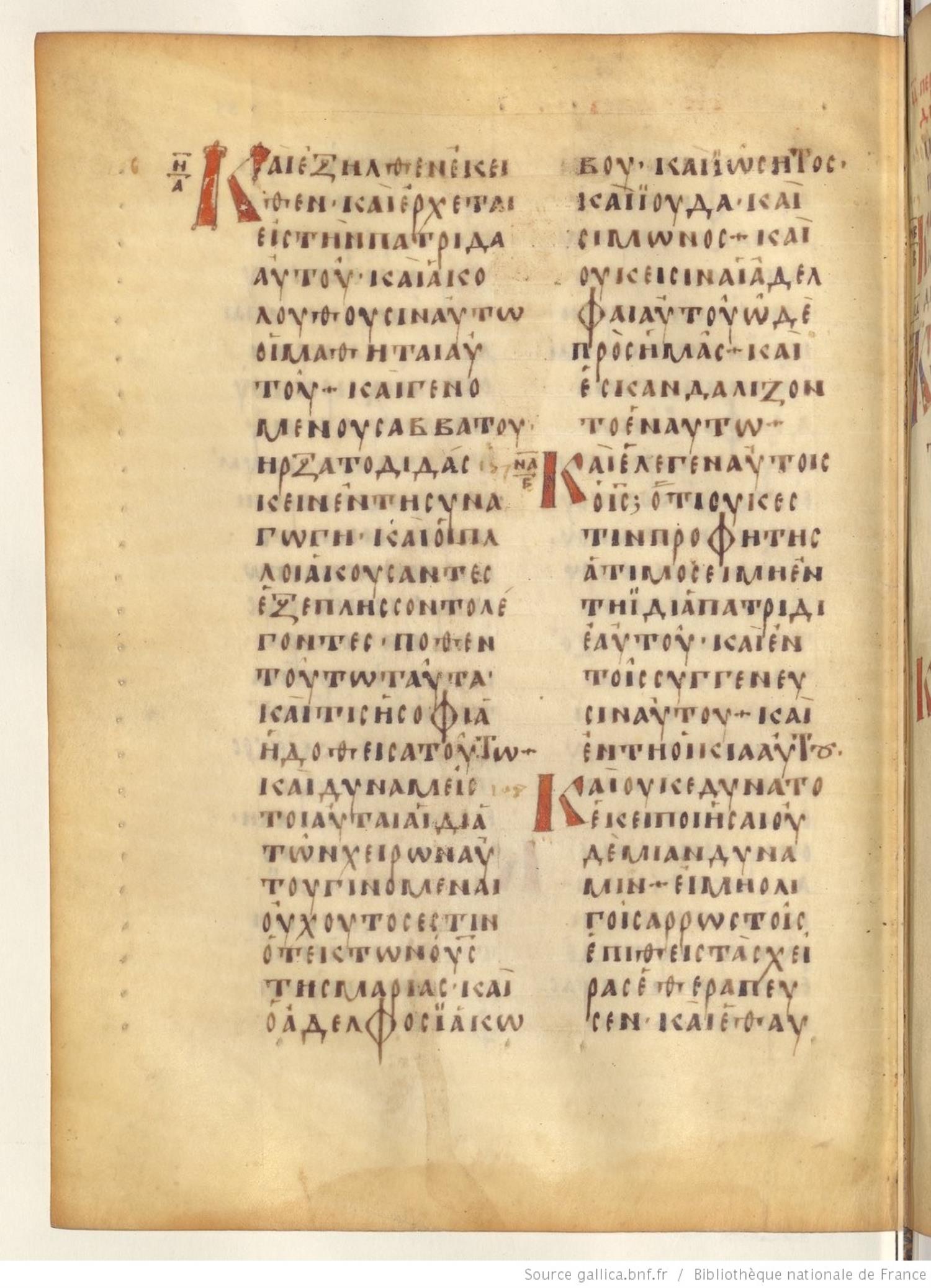 Codex Regius is an eighth-century (alt. date ninth-century) manuscript of the Gospels on parchment; 257 leaves, 2 columns, 25 lines per column. Only a selection of images are available at this time. For recent images please see the Bibliothèque Nationale.
