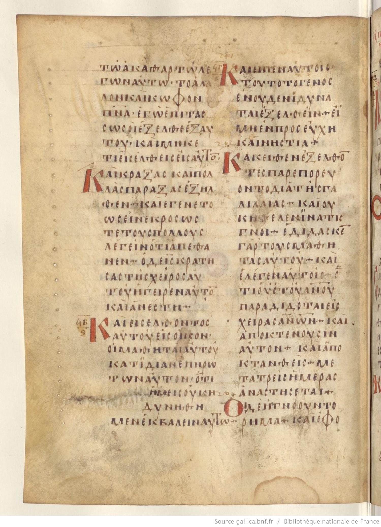 Codex Regius is an eighth-century (alt. date ninth-century) manuscript of the Gospels on parchment; 257 leaves, 2 columns, 25 lines per column. Only a selection of images are available at this time. For recent images please see the Bibliothèque Nationale.