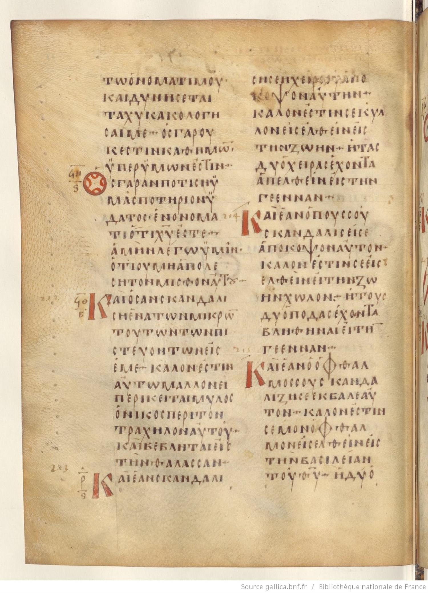 Codex Regius is an eighth-century (alt. date ninth-century) manuscript of the Gospels on parchment; 257 leaves, 2 columns, 25 lines per column. Only a selection of images are available at this time. For recent images please see the Bibliothèque Nationale.