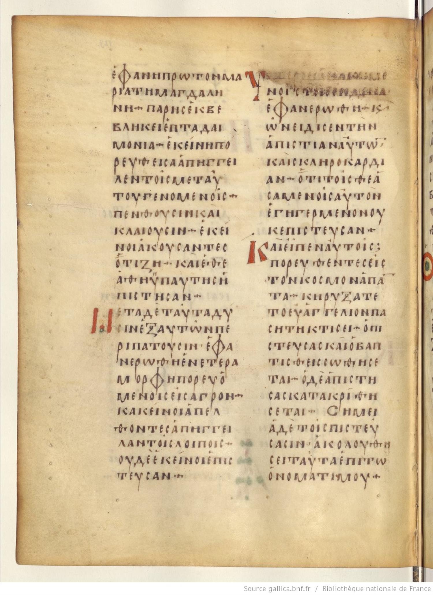 Ἀναστὰς δὲ πρωὶ πρώτῃ σαββάτου ἐφάνη πρῶτον Μαρίᾳ τῇ Μαγδαληνῇ, παρ´ ἧς ἐκβεβλήκει ἑπτὰ δαιμόνια.