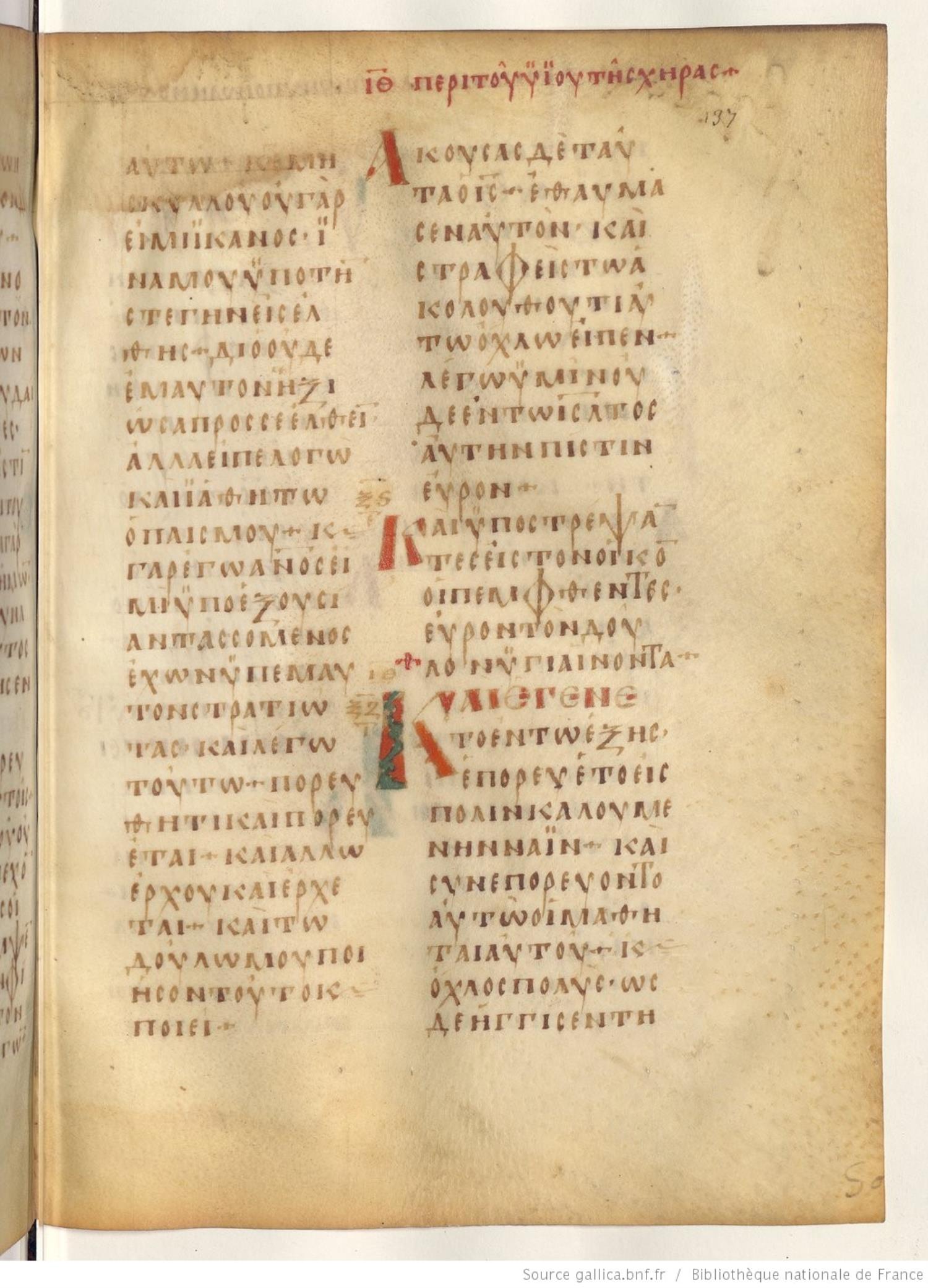 Codex Regius is an eighth-century (alt. date ninth-century) manuscript of the Gospels on parchment; 257 leaves, 2 columns, 25 lines per column. Only a selection of images are available at this time. For recent images please see the Bibliothèque Nationale.