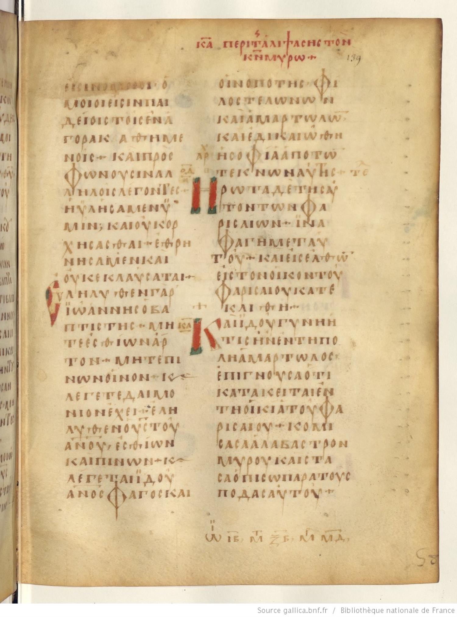 ἐλήλυθεν γὰρ Ἰωάνης / Ἰωάννης ὁ βαπτιστὴς μὴ ἔσθων / ἐσθίων ἄρτον μήτε πίνων οἶνον, καὶ λέγετε Δαιμόνιον ἔχει·