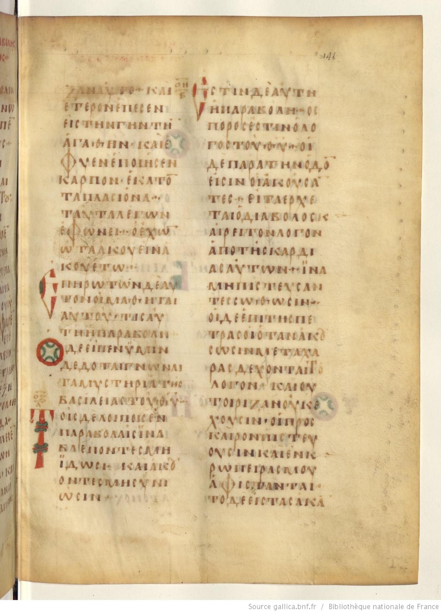 Codex Regius is an eighth-century (alt. date ninth-century) manuscript of the Gospels on parchment; 257 leaves, 2 columns, 25 lines per column. Only a selection of images are available at this time. For recent images please see the Bibliothèque Nationale.
