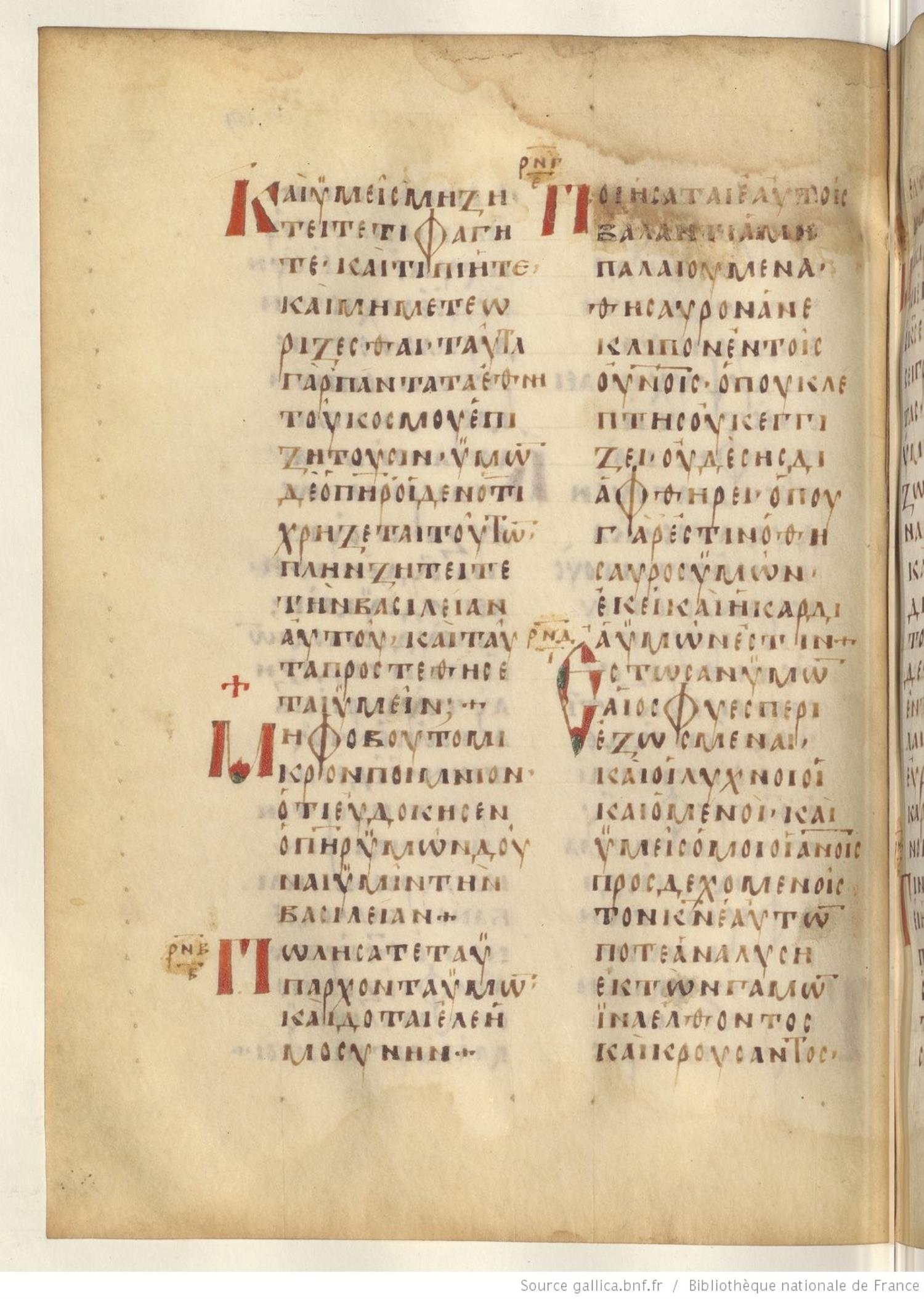 Codex Regius is an eighth-century (alt. date ninth-century) manuscript of the Gospels on parchment; 257 leaves, 2 columns, 25 lines per column. Only a selection of images are available at this time. For recent images please see the Bibliothèque Nationale.