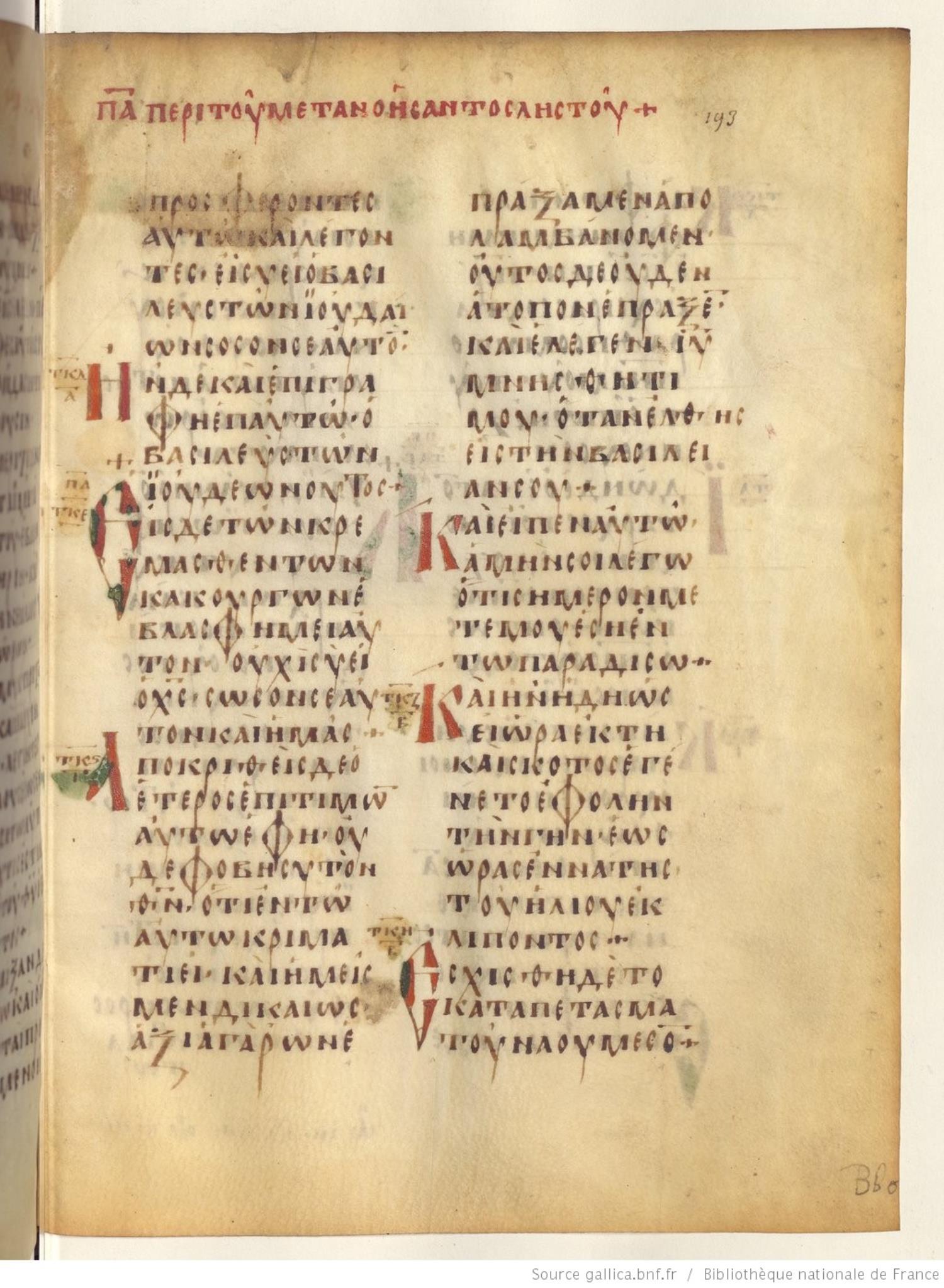 Codex Regius is an eighth-century (alt. date ninth-century) manuscript of the Gospels on parchment; 257 leaves, 2 columns, 25 lines per column. Only a selection of images are available at this time. For recent images please see the Bibliothèque Nationale.
