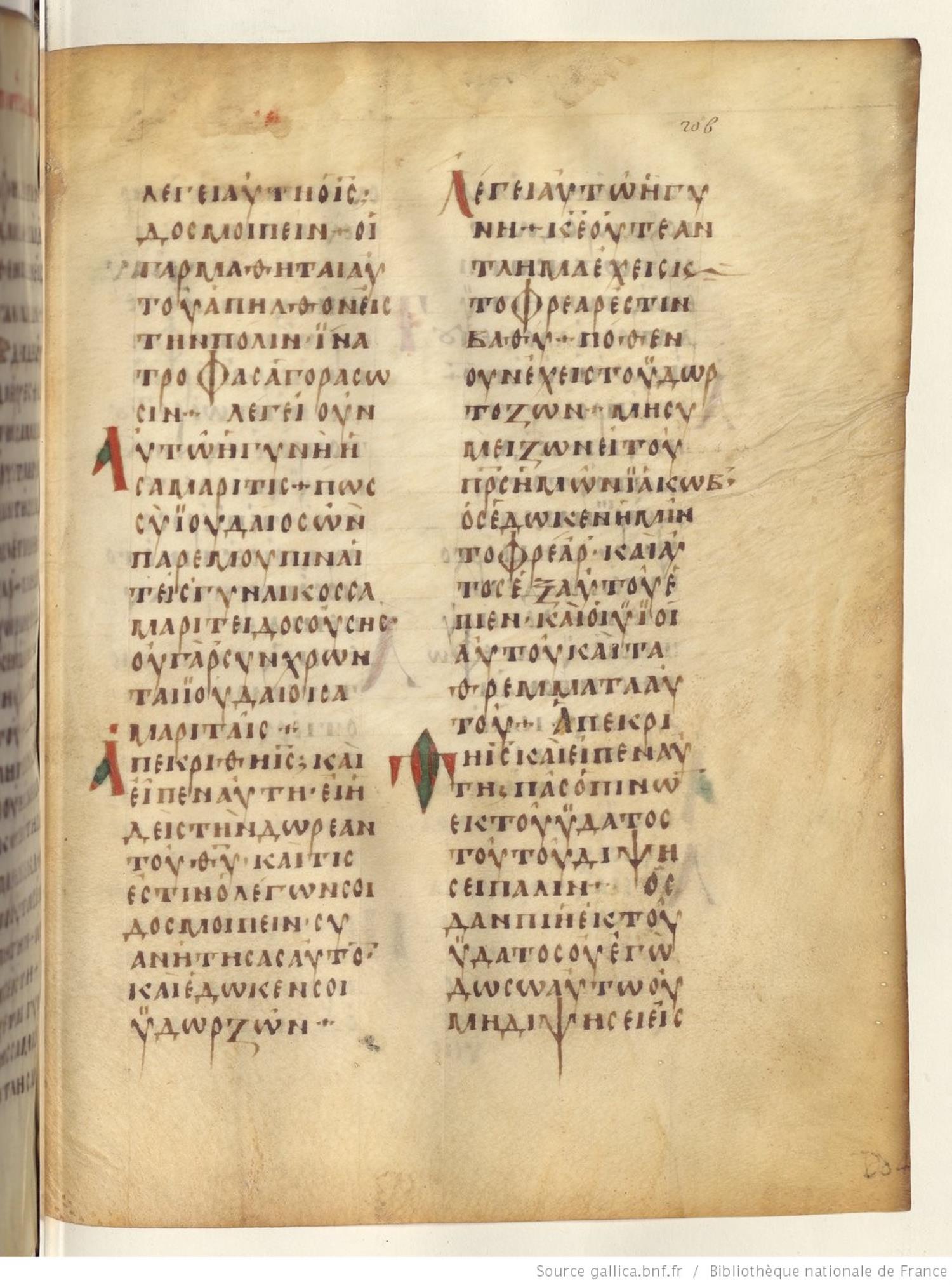 ἔρχεται γυνὴ ἐκ τῆς Σαμαρίας / Σαμαρείας ἀντλῆσαι ὕδωρ. λέγει αὐτῇ ὁ Ἰησοῦς Δός μοι πεῖν·