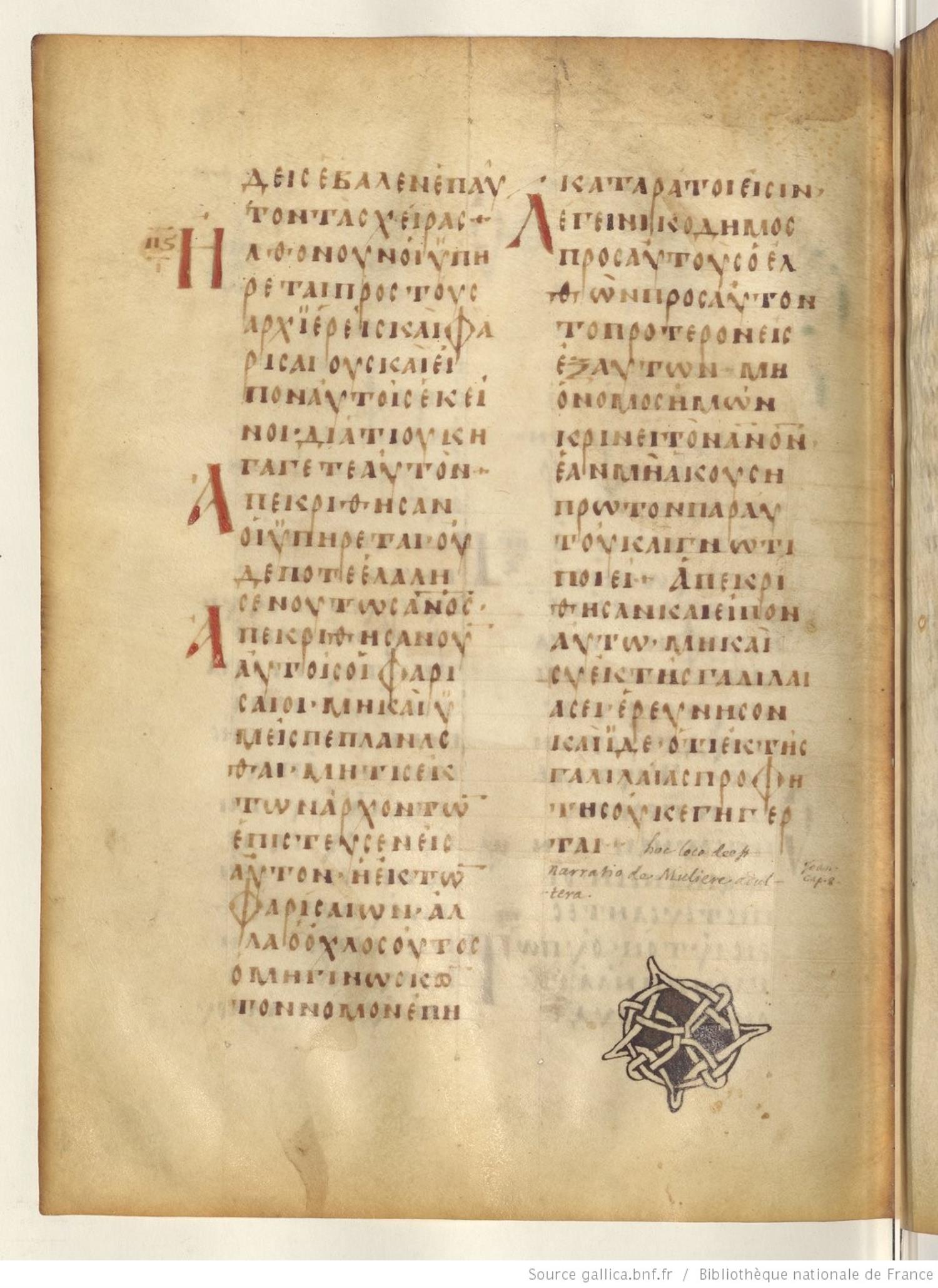 Codex Regius is an eighth-century (alt. date ninth-century) manuscript of the Gospels on parchment; 257 leaves, 2 columns, 25 lines per column. Only a selection of images are available at this time. For recent images please see the Bibliothèque Nationale.