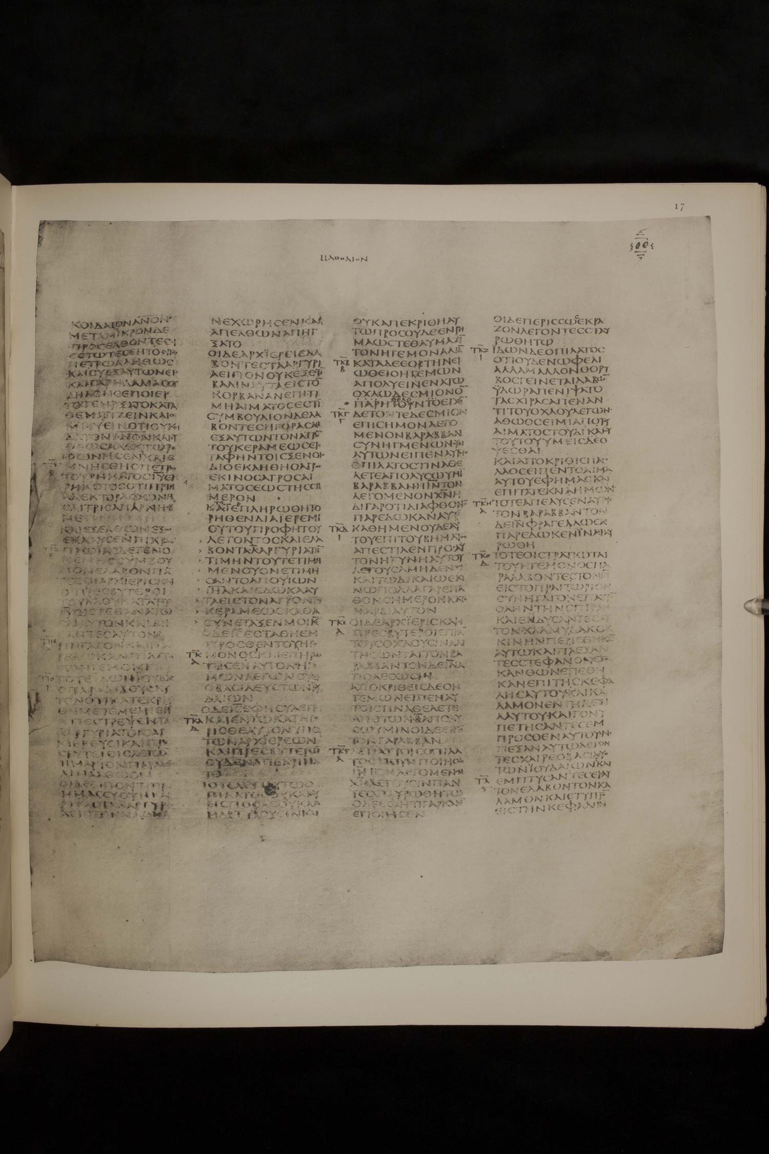 Codex Sinaiticus ? is a fourth-century manuscript of the Greek Old Testament, the New Testament, the Epistle of Barnabas, and the Shepherd of Hermas on parchment; The facsimile images are from the J. T. and Zelma Luther Archives, A. Webb Roberts Library, Southwestern Baptist Theological Seminary. For more recent digital images, please visit the Codex Sinaiticus Project