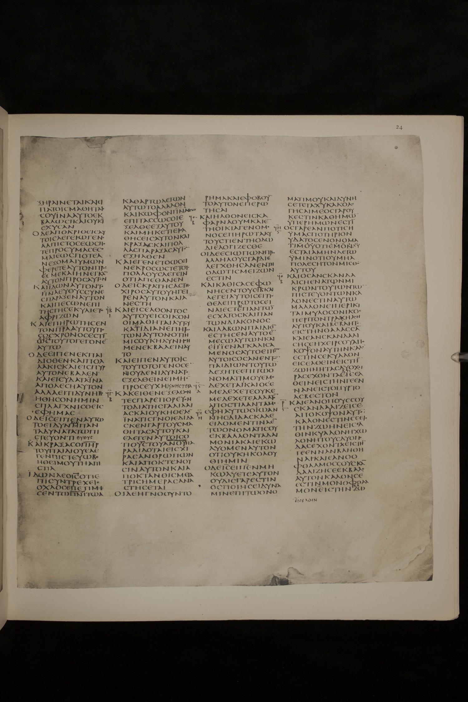 Codex Sinaiticus ? is a fourth-century manuscript of the Greek Old Testament, the New Testament, the Epistle of Barnabas, and the Shepherd of Hermas on parchment; The facsimile images are from the J. T. and Zelma Luther Archives, A. Webb Roberts Library, Southwestern Baptist Theological Seminary. For more recent digital images, please visit the Codex Sinaiticus Project