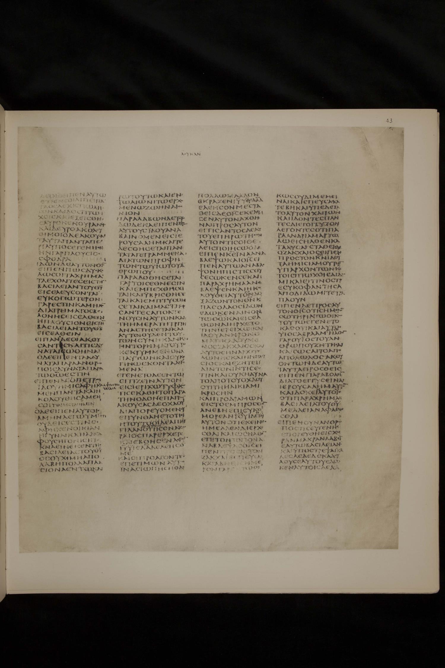 Codex Sinaiticus ? is a fourth-century manuscript of the Greek Old Testament, the New Testament, the Epistle of Barnabas, and the Shepherd of Hermas on parchment; The facsimile images are from the J. T. and Zelma Luther Archives, A. Webb Roberts Library, Southwestern Baptist Theological Seminary. For more recent digital images, please visit the Codex Sinaiticus Project