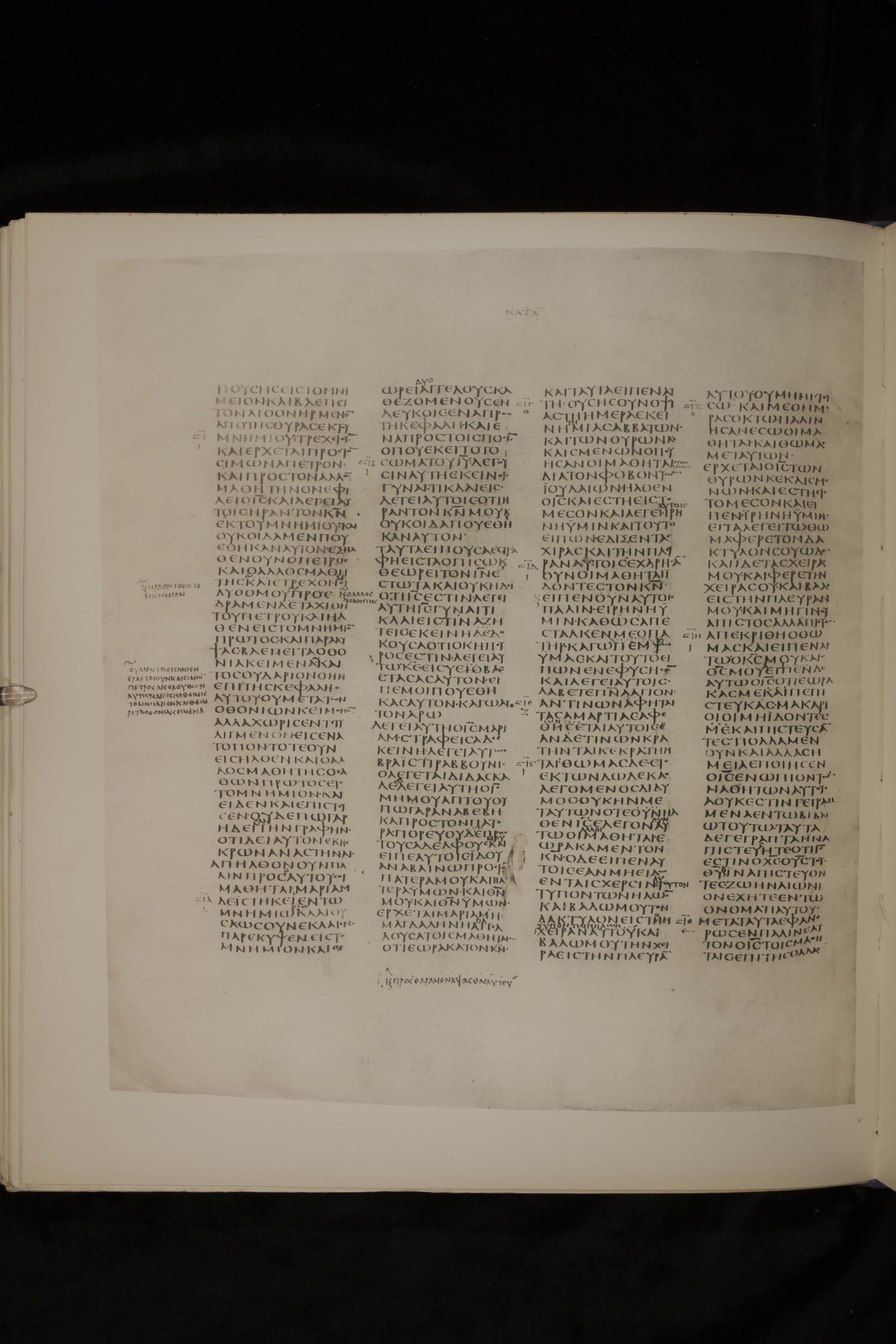 Codex Sinaiticus ? is a fourth-century manuscript of the Greek Old Testament, the New Testament, the Epistle of Barnabas, and the Shepherd of Hermas on parchment; The facsimile images are from the J. T. and Zelma Luther Archives, A. Webb Roberts Library, Southwestern Baptist Theological Seminary. For more recent digital images, please visit the Codex Sinaiticus Project