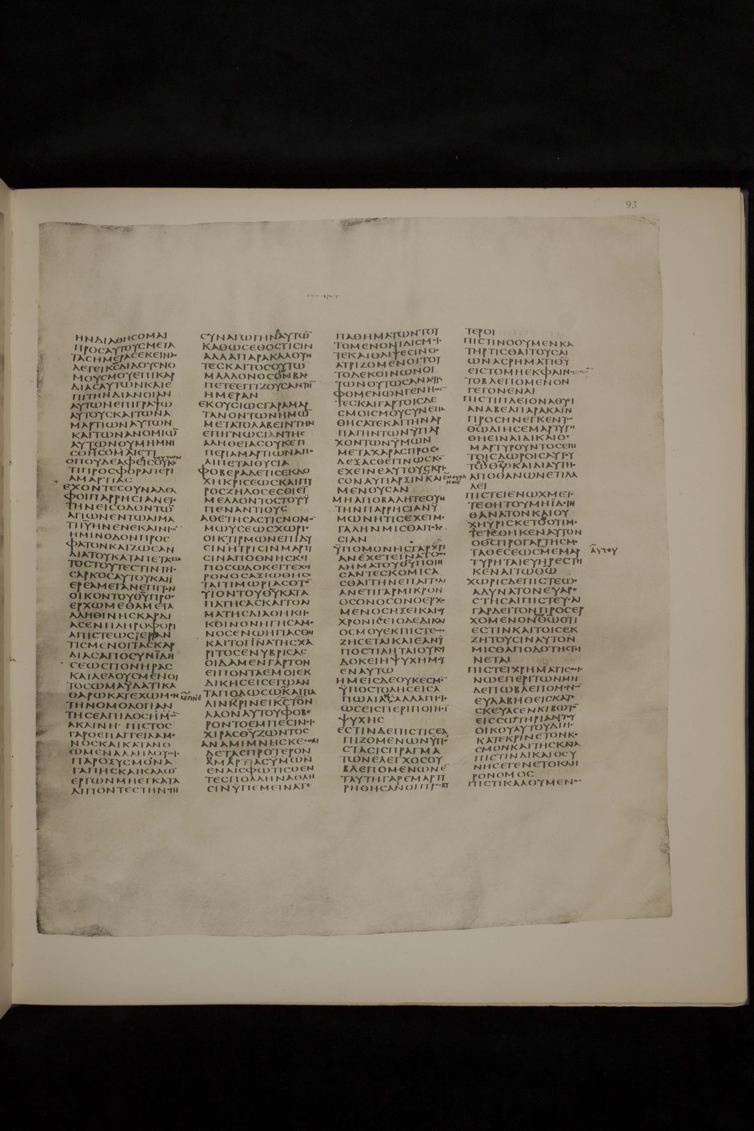 Codex Sinaiticus ? is a fourth-century manuscript of the Greek Old Testament, the New Testament, the Epistle of Barnabas, and the Shepherd of Hermas on parchment; The facsimile images are from the J. T. and Zelma Luther Archives, A. Webb Roberts Library, Southwestern Baptist Theological Seminary. For more recent digital images, please visit the Codex Sinaiticus Project