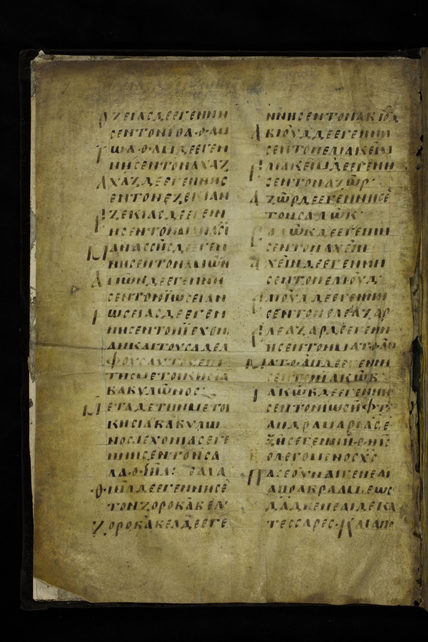 Ninth century majuscule of the Gospels on parchment; 254 leaves, 2 columns, 24-31 lines per column.