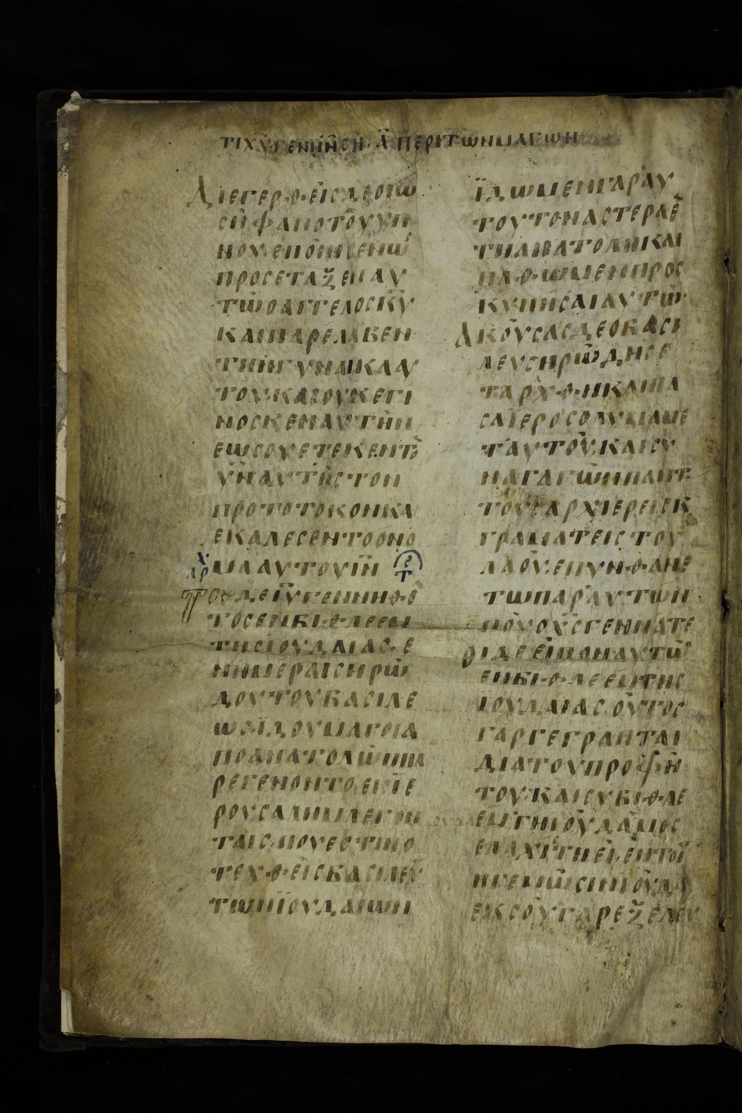 Ninth century majuscule of the Gospels on parchment; 254 leaves, 2 columns, 24-31 lines per column.