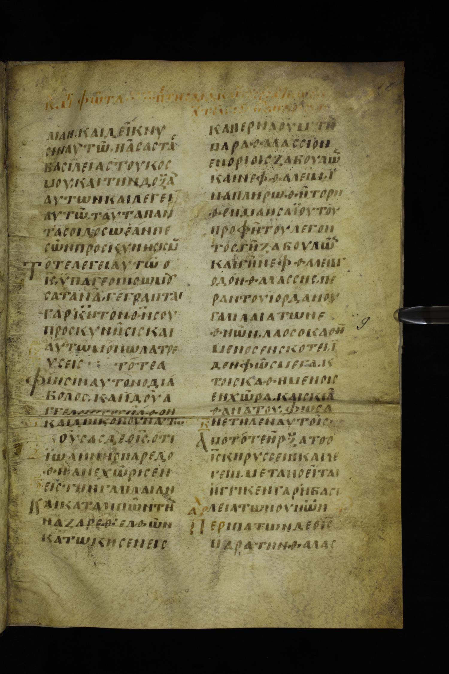 Ninth century majuscule of the Gospels on parchment; 254 leaves, 2 columns, 24-31 lines per column.