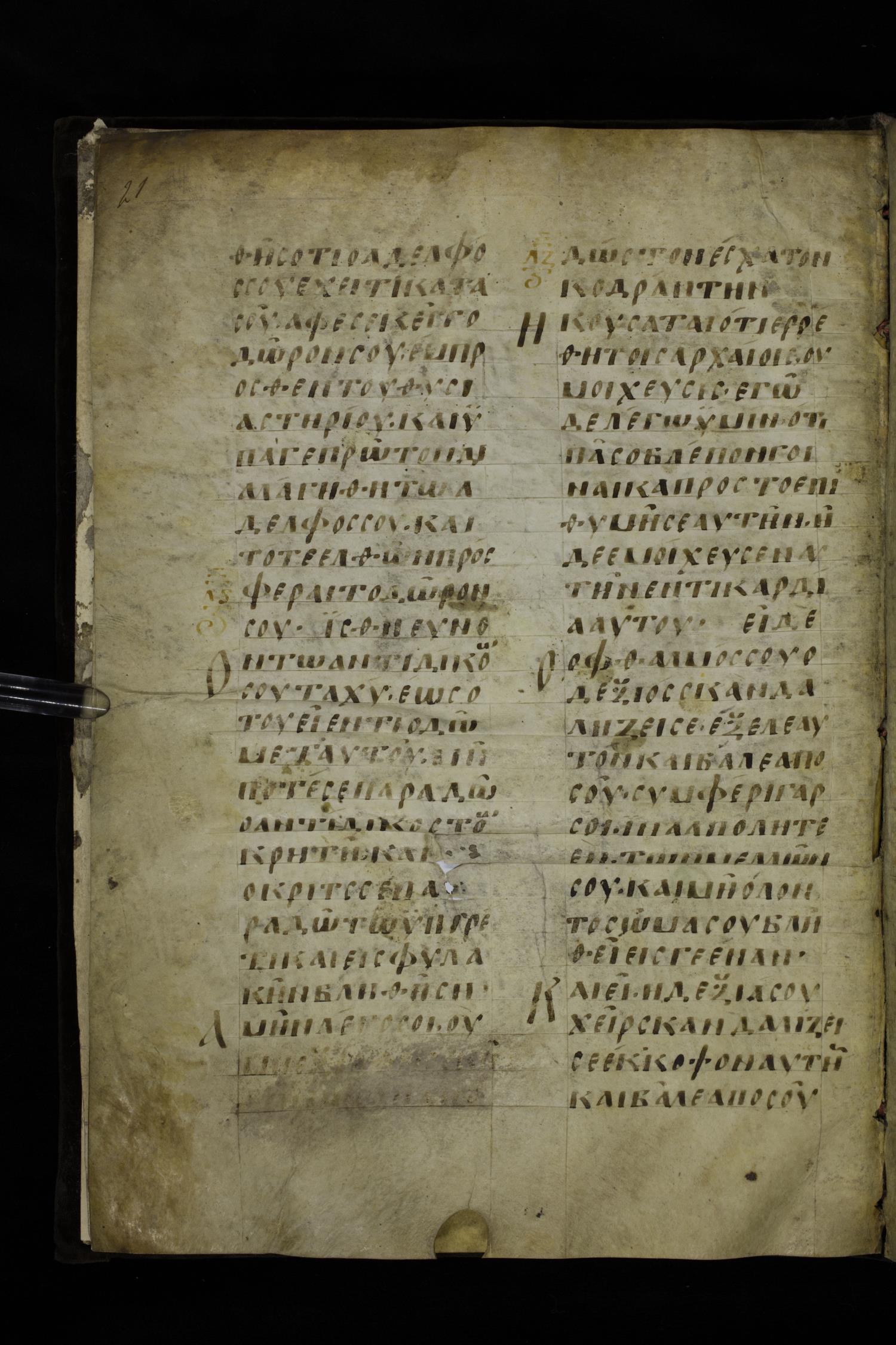 Ninth century majuscule of the Gospels on parchment; 254 leaves, 2 columns, 24-31 lines per column.
