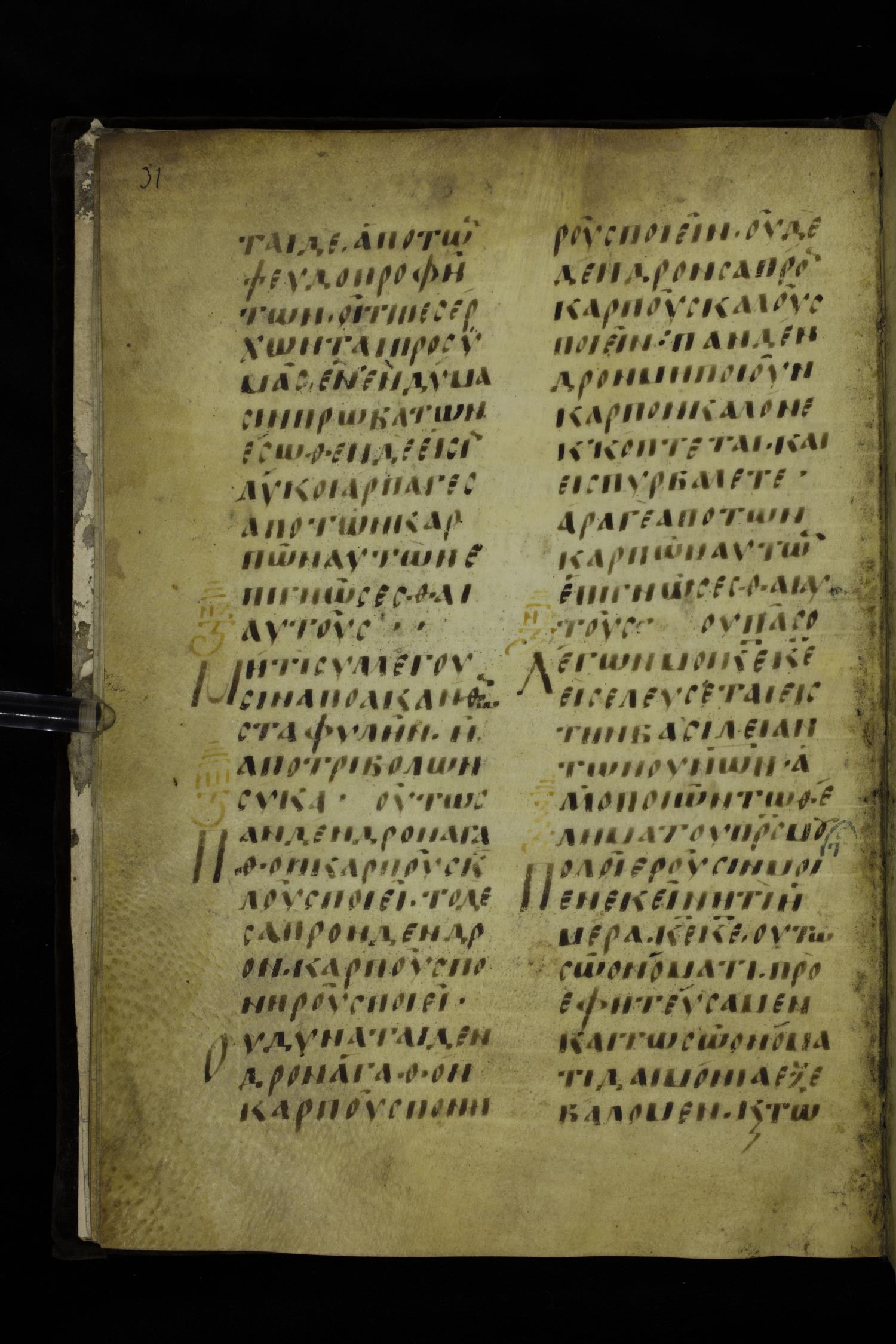 Ninth century majuscule of the Gospels on parchment; 254 leaves, 2 columns, 24-31 lines per column.