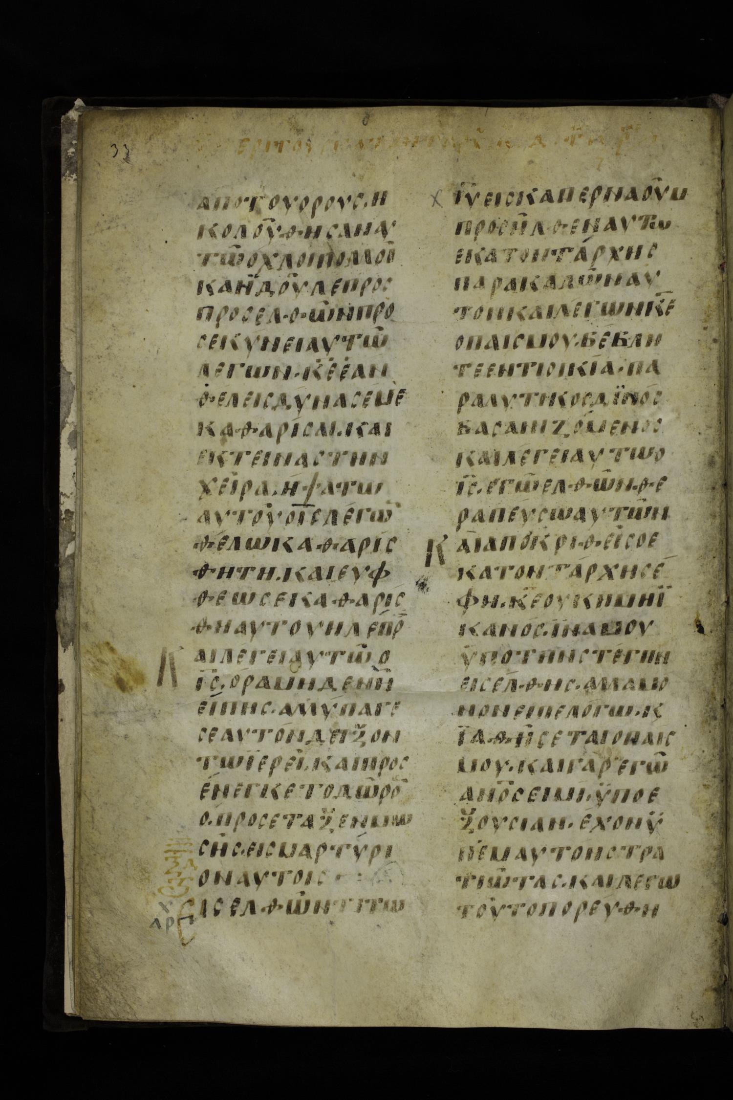 Ninth century majuscule of the Gospels on parchment; 254 leaves, 2 columns, 24-31 lines per column.