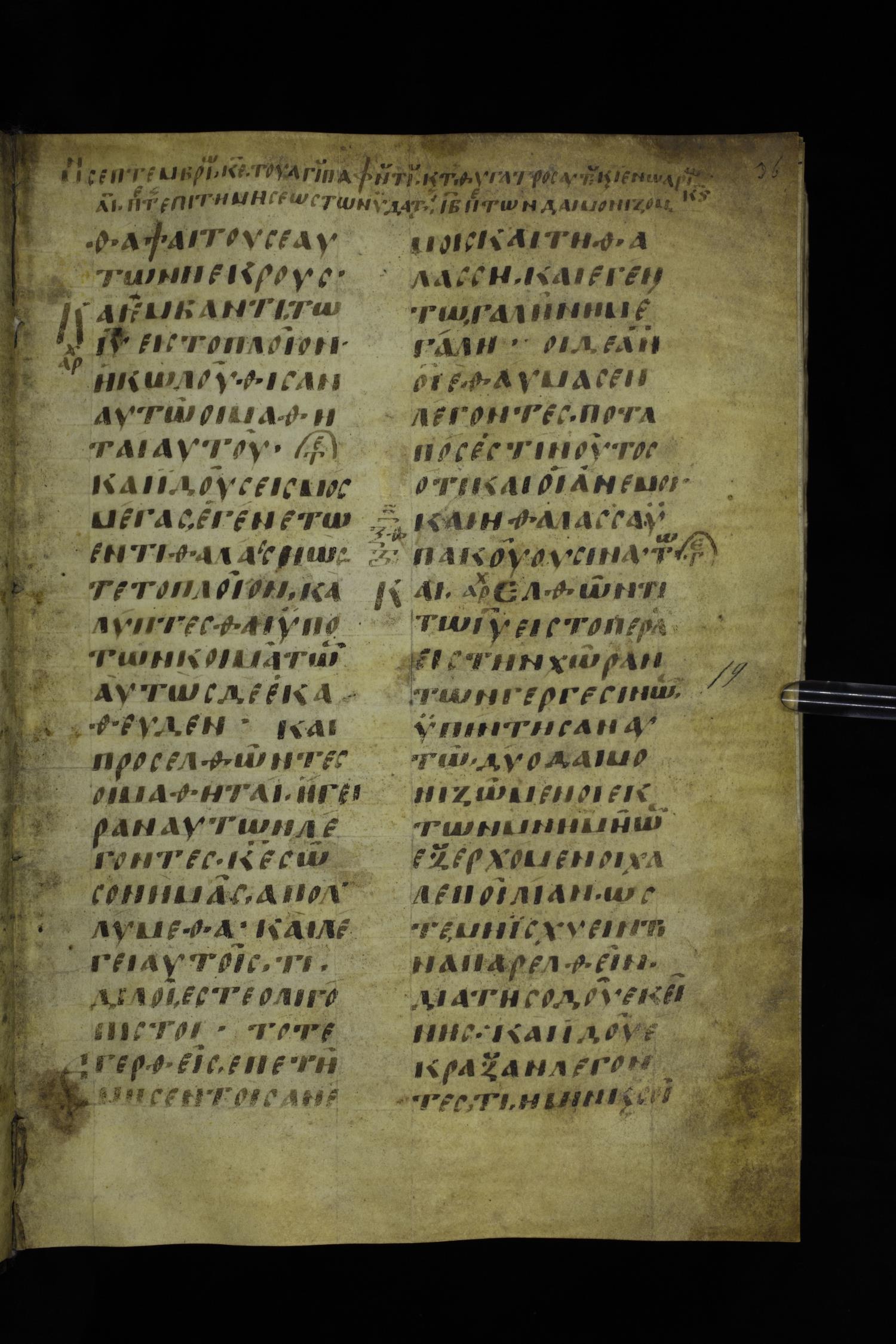 Ninth century majuscule of the Gospels on parchment; 254 leaves, 2 columns, 24-31 lines per column.
