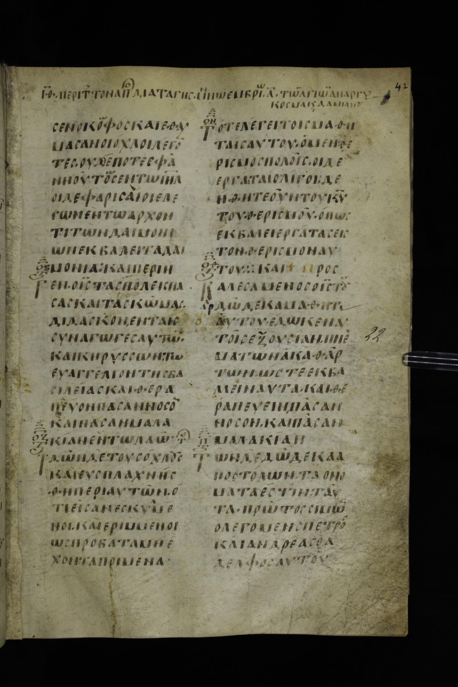 Ninth century majuscule of the Gospels on parchment; 254 leaves, 2 columns, 24-31 lines per column.