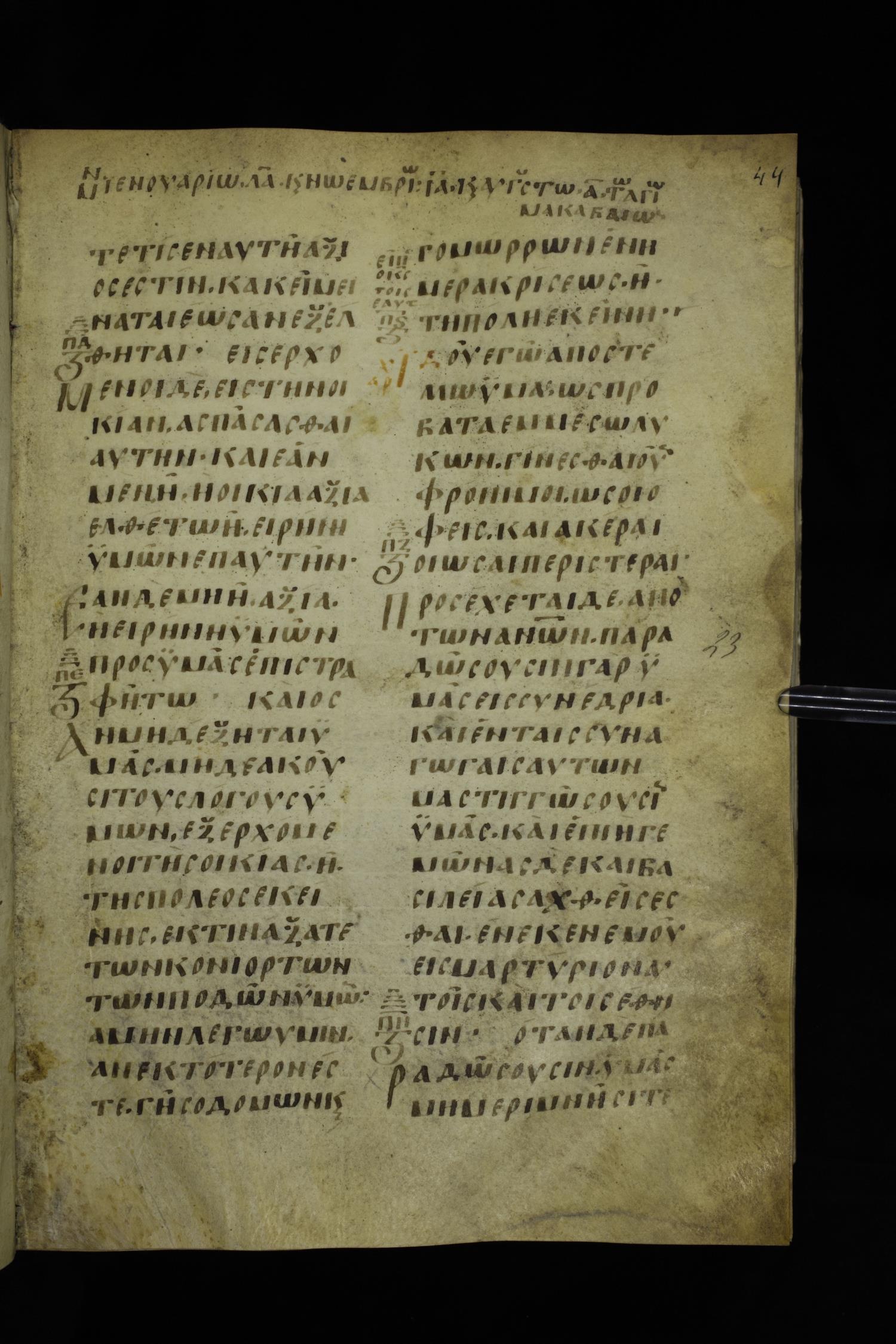 Ninth century majuscule of the Gospels on parchment; 254 leaves, 2 columns, 24-31 lines per column.