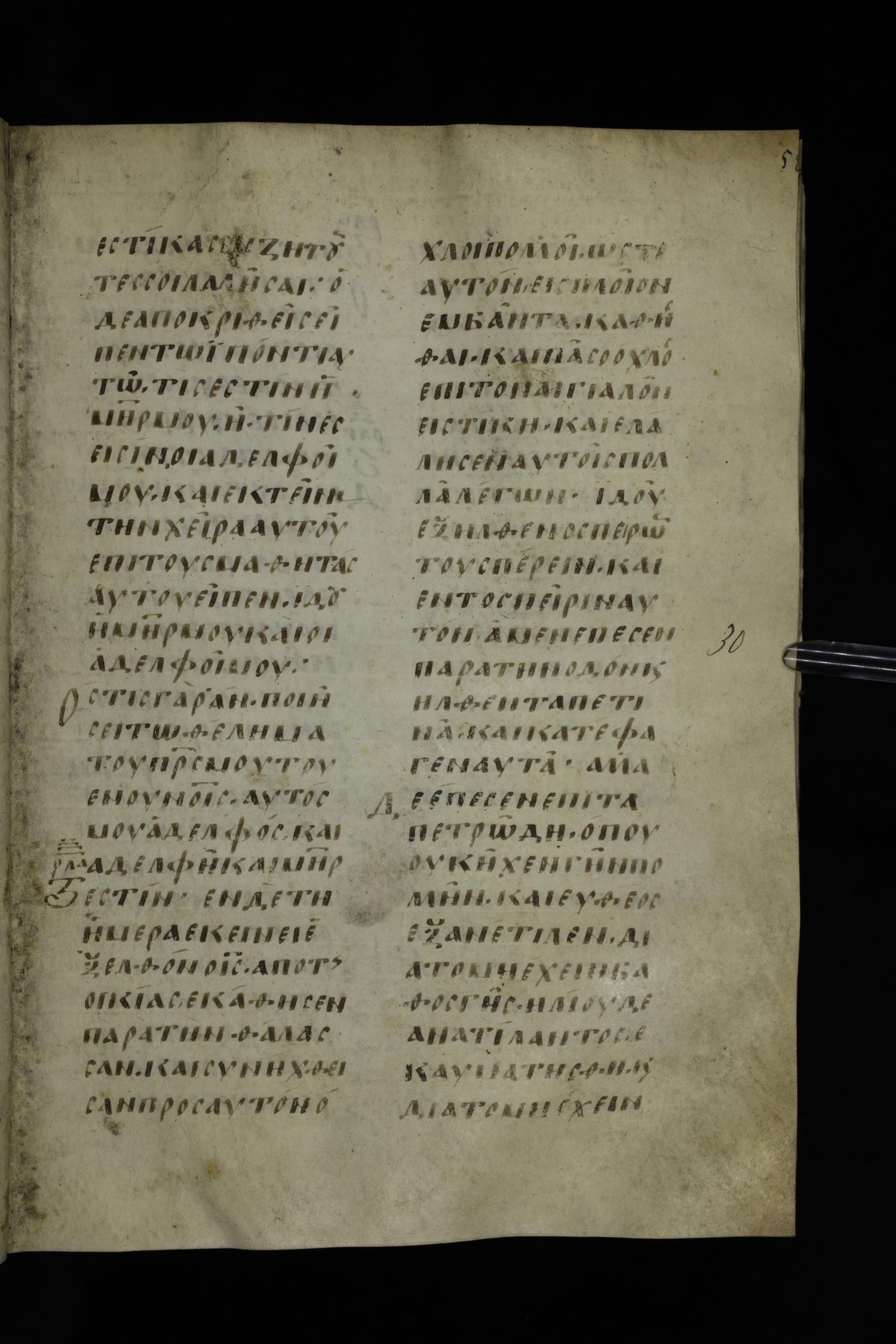 Ninth century majuscule of the Gospels on parchment; 254 leaves, 2 columns, 24-31 lines per column.