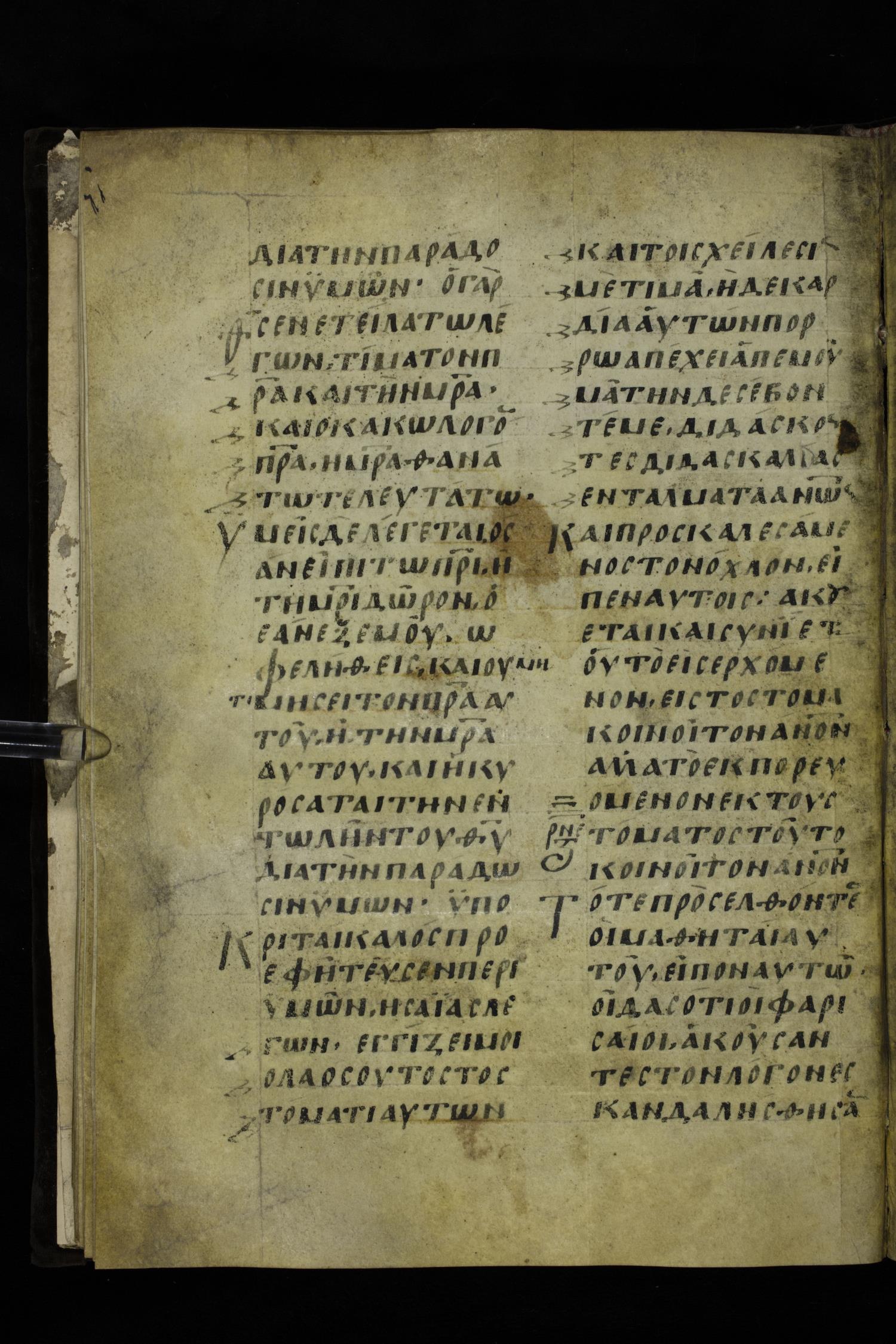 Ninth century majuscule of the Gospels on parchment; 254 leaves, 2 columns, 24-31 lines per column.