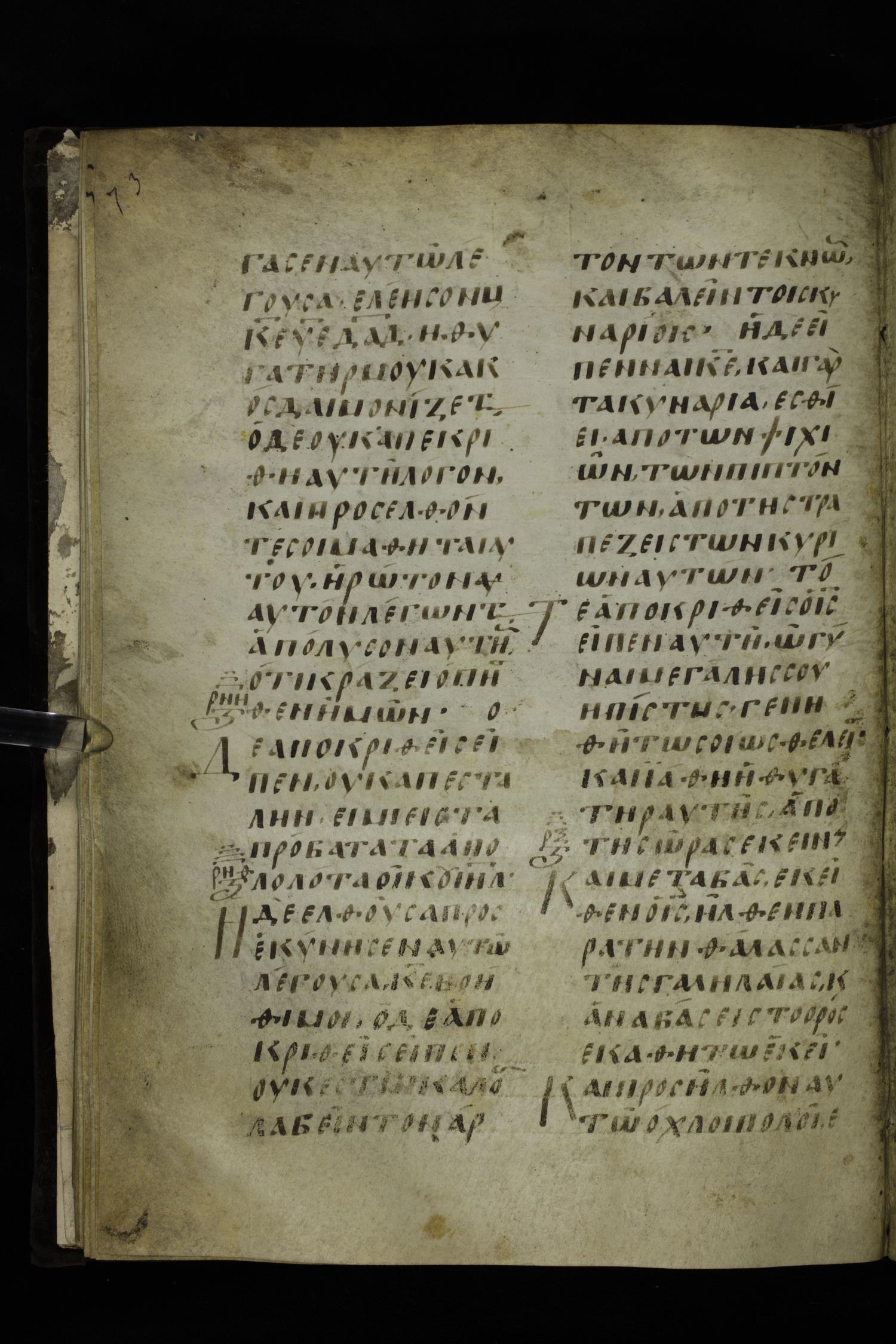 Ninth century majuscule of the Gospels on parchment; 254 leaves, 2 columns, 24-31 lines per column.