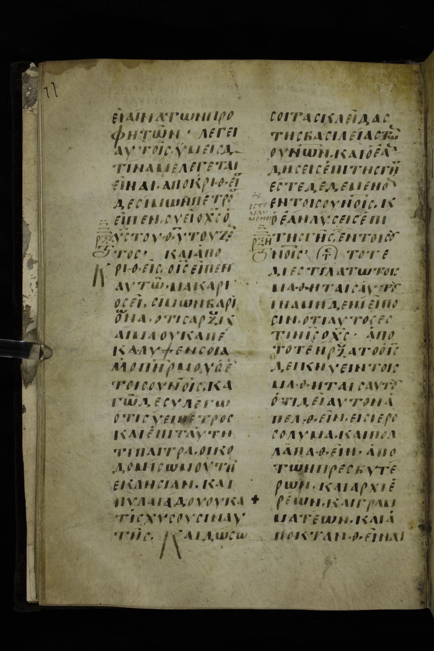 Ninth century majuscule of the Gospels on parchment; 254 leaves, 2 columns, 24-31 lines per column.