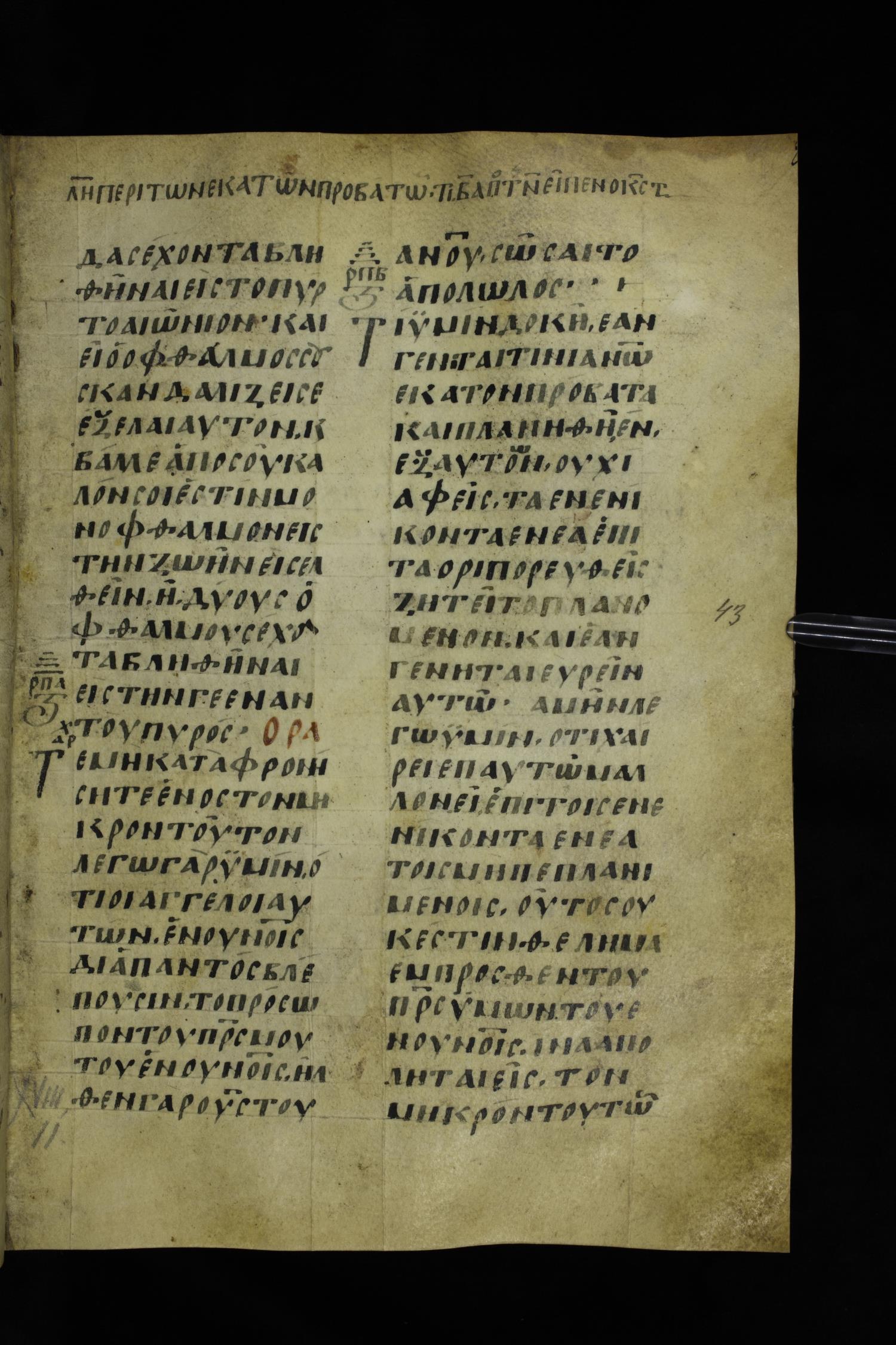 Ninth century majuscule of the Gospels on parchment; 254 leaves, 2 columns, 24-31 lines per column.