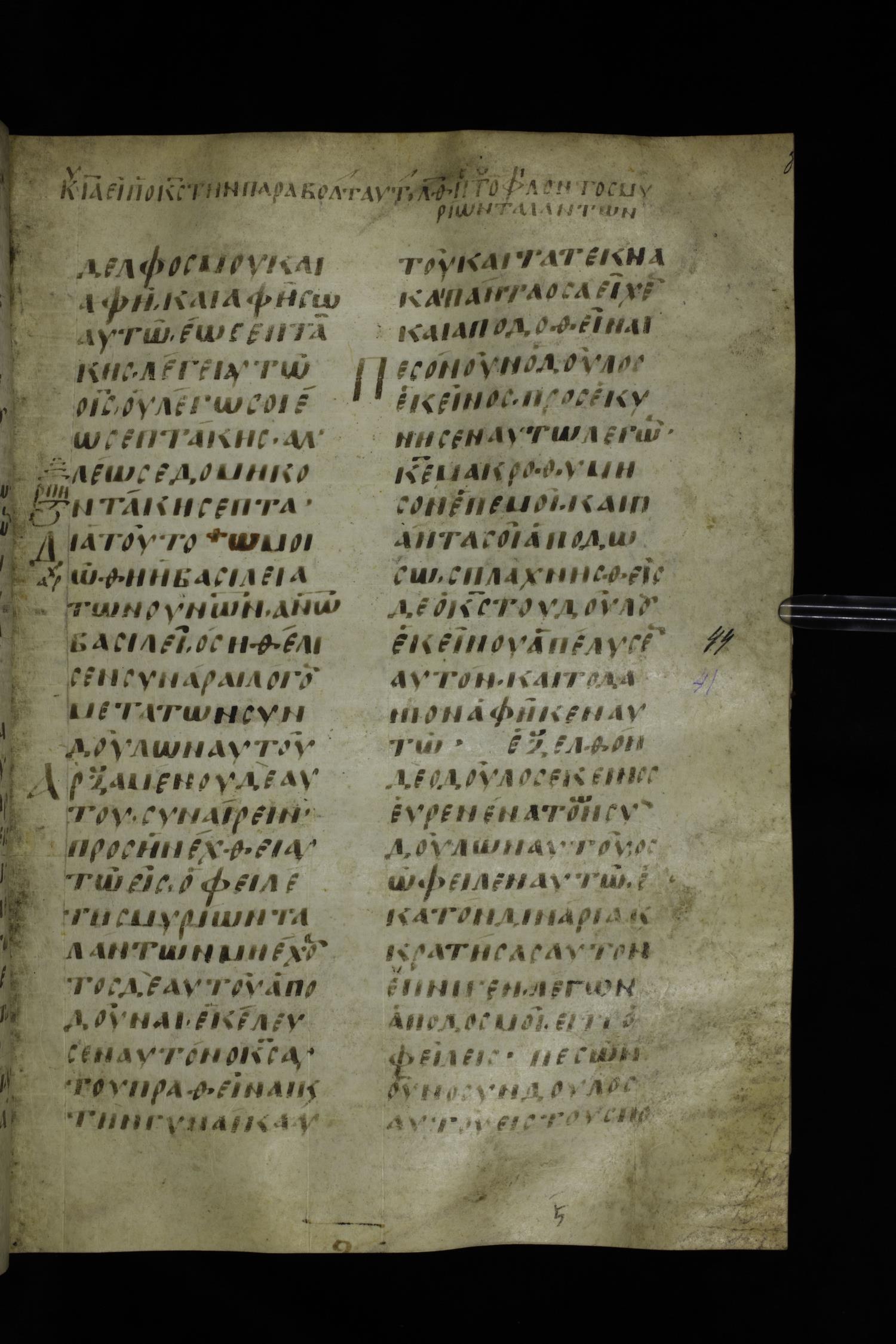 Ninth century majuscule of the Gospels on parchment; 254 leaves, 2 columns, 24-31 lines per column.